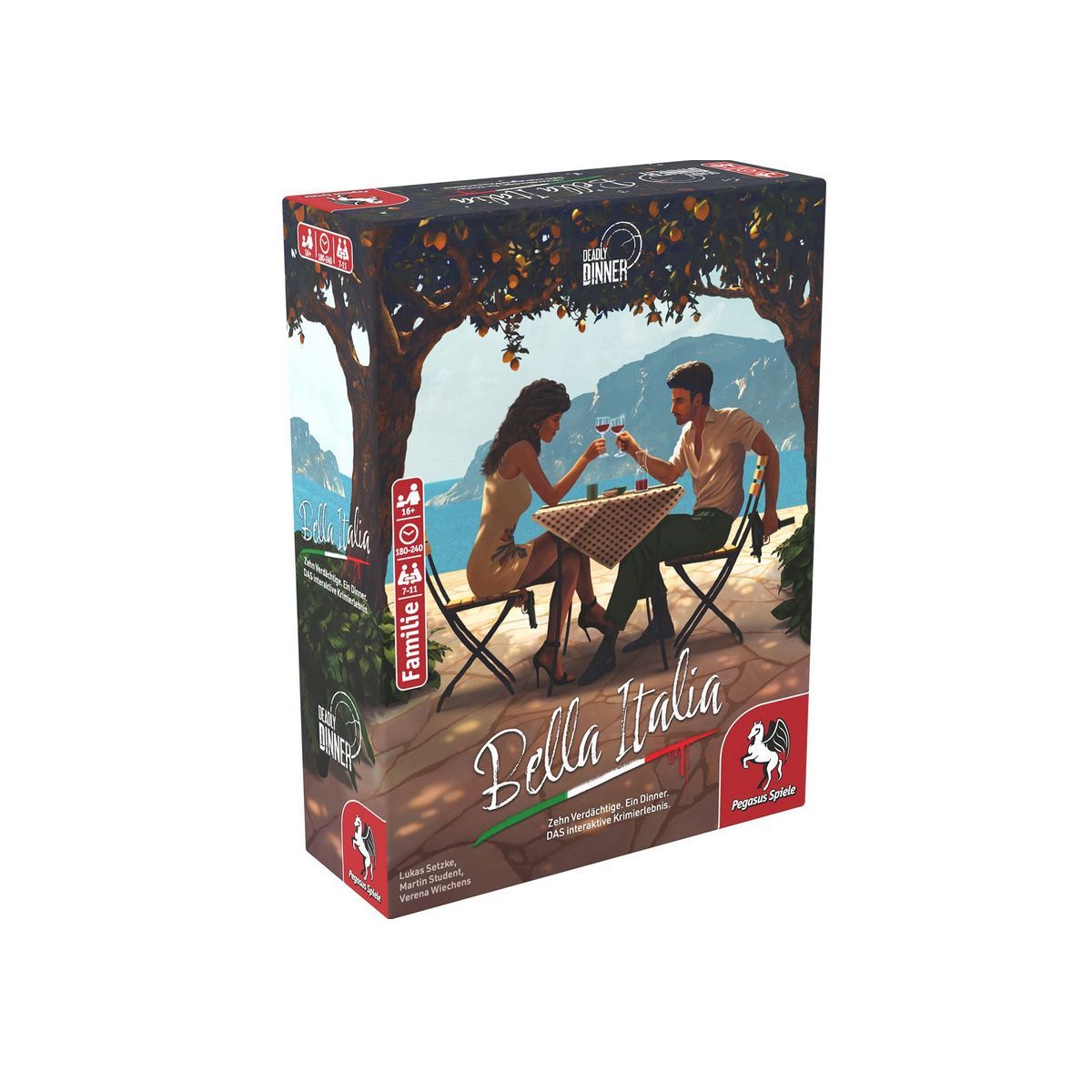 Auf Sizilien im Jahr 1984 ist die Mafiafamilie Di Salvo auf der Höhe ihrer Macht. Ihr Oberhaupt Francesco Di Salvo hat Freunde und Familie zu einer Feier auf seinem Anwesen eingeladen. Es wird gemunkelt, dass er jemanden für seine Nachfolge bestimmen will und gleich mehrere Personen wollen diese Entscheidung zu ihren Gunsten beeinflussen. Doch dann wird Francesco tot in seinen Privaträumen aufgefunden. Hat jemand eine alte Rechnung mit dem mächtigen Paten von Sizilien beglichen oder wurde Francesco zum Schweigen gebracht, bevor er seine Entscheidung bekannt geben konnte? Der bzw. die Gastgeber*in lädt die Gäste zu einem gemeinsamen Dinner ein, bei dem diese die Rollen von Mordverdächtigen übernehmen. Jemand von ihnen hat den Mord begangen, doch alle haben Geheimnisse, die sie lieber für sich behalten wollen. Über drei Runden hinweg versuchen sie, hinter die Geheimnisse der anderen Spielenden zu kommen, ohne sich selbst verdächtig zu machen. Das gemeinsame Ziel ist es, den Mordfall aufzuklären – oder mit der blutigen Tat davon zu kommen. In Deadly Dinner – Bella Italia kann außerdem eine Person die Rolle eines bzw. einer nicht tatverdächtigen Detektiv*in übernehmen. Eine Partie Deadly Dinner besteht aus drei Runden, in denen alle neue Informationen zum Tathergang bekommen. In jeder Runde erhalten die Spielenden außerdem geheime Objekte, die in Umschlägen in der Verpackung zu finden sind. Die Spielenden müssen ihre Informationen und Hinweise in der Gruppe diskutieren, um am Ende den Täter bzw. die Täterin zu identifizieren. Um sich vorbereiten zu können, sollten die Spielenden ein paar Tage vor dem Spielen die Startinformationen zu ihrem Charakter erhalten..