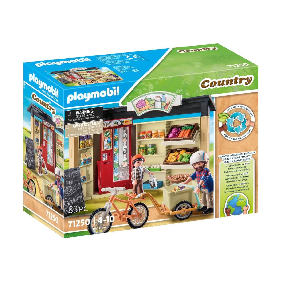 Frisch, regional und am besten Bio - so sollen Lebensmittel sein. Im 24 Stunden Hofladen können Kunden rund um die Uhr frisches Obst, Gemüse, Milchprodukte und Getränke kaufen und das zu fairen Preisen. Der Bauer erntet das Gemüse frisch vom Feld und bringt es direkt in den Hofladen. In den Regalen können die Lebensmittel ordentlich aufgestellt und gut präsentiert werden. Das PLAYMOBIL-Spielset 24-Stunden-Hofladen lädt Kinder dazu ein in die Rolle von Landwirten und Ladeninhabern zu schlüpfen und lustige Verkaufssituationen nachzuspielen. Produktdetails: • Das 83-teilige PLAYMOBIL-Spielzeugset enthält zwei PLAYMOBIL-Figuren, einen Hofladen mit Milchautomat, Eier, Obst, Gemüse und verschiedene weitere Lebensmittel. • Die PLAYMOBIL Bauernhof-Spielwelt inspiriert mit authentischen Details zum fantasievollen Rollenspiel und hilft Kindern wichtige Fähigkeiten und Selbstvertrauen zu entwickeln. • Gut für die Umwelt: Alle Spielsets der neuen Bauernhof-Welt bestehen zu mehr als 80 % aus nachhaltigen Materialien. Inhalt: 1 Mann, 1 Junge Zubehör: 1 24h-Hofladen, 1 Milchautomat,1 Fahrrad m. Anhänger, 1 Fahrradhelm, 1 Kinderfahrradhelm, 2 Erdbeermarmeladen, 2 Honig, 1 Gewürzgurken, 1 eingeletes Gemüse, 2 6er-Eier, 1 Kartoffelkorb, 8 Milch, 4 Apfelsaft, 3 Kuchenbackmischungen, 1 Angebotstafel, 3 Kisten, 1 Rotkohl, 1 Karotten, 1 Äpfel.