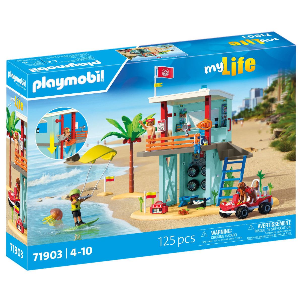 Oh nein! Die Feuerqualle hat die Kitesurferin am Bein erwischt. Wie gut, dass der Rettungsschwimmer auf seinem Rettungsturm einen guten Überblick über die Badegäste am Strand und im Wasser hat. Blitzschnell schnappt er sich sein Rettungsboard und eilt über die Rutschstange zum Einsatzort. Sein Hund mit umgehänger Rettungsweste unterstützt ihn tatkräftig, die Verletzte sicher an den Strand zu bringen und anschließend zu versorgen. Für Einsätze in weiterer Entfernung sputet der Rettungsschwimmer in seinem Beach-Buggy zur Hilfe. Im unteren Teil des Turms hat er dafür extra eine kleine Reparaturwerkstatt mit umfangreichem Zubehör..
