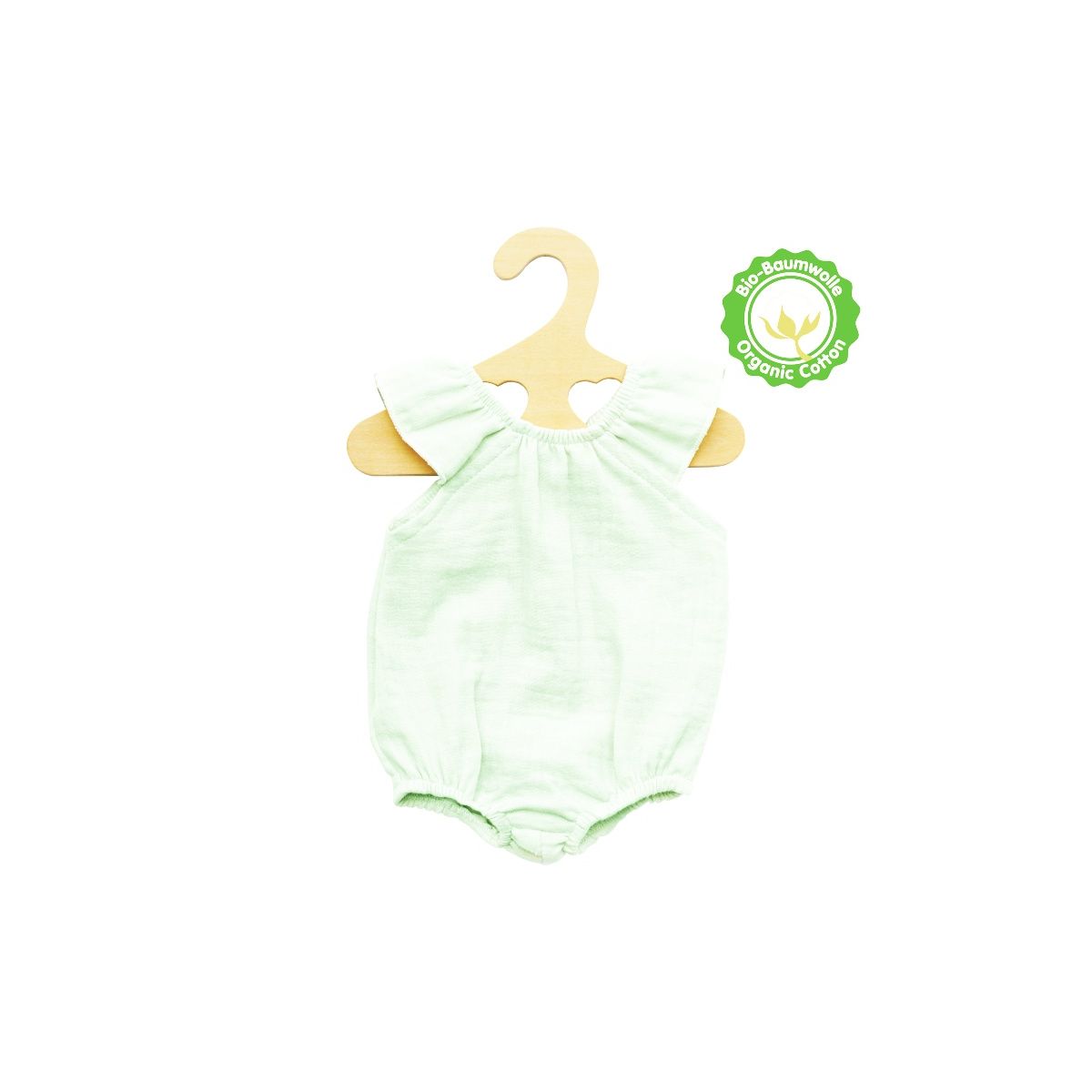 Der niedliche Puppenbody mit Rüschen von Heless aus 100 % Bio-Baumwolle ist ein multifunktionaler Basic-Artikel für Deine Puppe. Ob unter einem Strampler, zu einer Hose oder einem Rock, als luftig-leichtes Sommeroutfit oder als Nachtwäsche – der Puppenbody in pastelligem Mint passt einfach immer. Der weiche Musselinstoff stammt aus kontrolliert biologischem Anbau und bietet Dir unbedenklichen und grenzenlosen Spielspaß mit Deiner Puppe. Die hübschen Rüschen an den Schultern und der lockere Schnitt machen aus ihr einen absoluten Blickfang. Ein toller Basic-Artikel aus hochwertigem Material, der in keinem Puppenkleiderschrank fehlen darf. Der Klettverschluss sorgt dafür, dass der Puppenbody kinderleicht an- und ausgezogen werden kann. Der Body passt den meisten marktgängigen Puppen der Größe 28-35 cm. Es ist auch in einer weiteren Ausführung für Puppengröße 35-45 cm (Art.-Nr. 2413) erhältlich. Der Artikel wird auf einem Holzkleiderbügel geliefert..