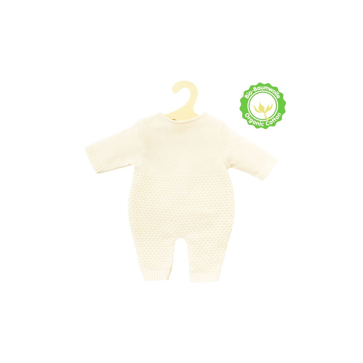 Der gemütliche Puppen-Strickstrampler von Heless aus 100 % Bio-Baumwolle hält Deine Puppe auch an kalten Tagen mollig warm. Der Strick aus kontrolliert biologischem Anbau in sanftem Ecru verleiht Dir ein durch und durch gutes Gefühl, denn er ist ganz weich und kratzt überhaupt nicht. Das Material ist zudem elastisch, sodass sich der Strampler perfekt an den Körper Deiner Puppe anschmiegt. Das zeitlose und schlichte Design besteht aus zwei Strickmustern und macht den Strampler zu einem modischen Hingucker. Ein tolles Winter-Outfit, in welchem sich Deine Puppe geborgen und rundum wohl fühlt. Separat erhältlich ist zudem ein 2-teiliges Accessoires-Set (Art.-Nr. 4801) bestehend aus Bommelmütze und Strickschuhen, mit dem Du den Strampler perfekt ergänzen kannst. Der Klettverschluss im Rücken sorgt dafür, dass der Puppenstrampler kinderleicht an- und ausgezogen werden kann. Der Strampler passt den meisten marktgängigen Puppen der Größe 28-35 cm. Es ist auch in einer weiteren Ausführung für Puppengröße 35-45 cm (Art.-Nr. 2480) erhältlich. Der Artikel wird auf einem Holzkleiderbügel geliefert..