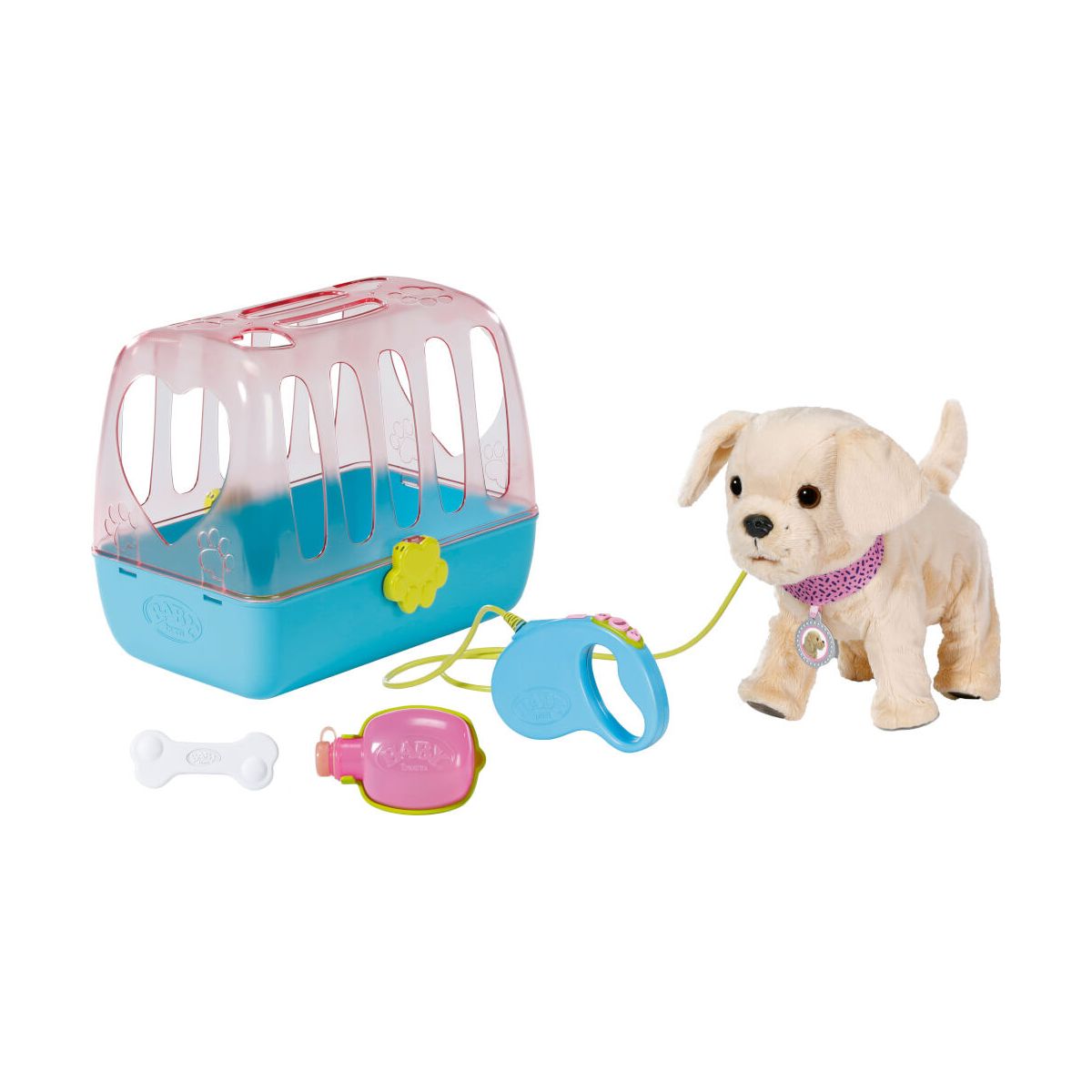 BABY borns Freund, der kleine Welpe Lucky läuft auf Kommando bei Fuß, bellt freudig und schnüffelt. Streichelt man ihm über den Rücken, wedelt er mit dem Schwanz und gibt wohlige Geräusche von sich. Er kann echtes Wasser aus seinem Napf trinken. Dazu senkt er mit herausgestreckter Zunge den Kopf und du hörst ihn schlürfen. Nach dem Trinken hebt er sein Beinchen und macht Pipi, Fast wie ein richtiger Hund! Der braucht natürlich auch seinen Knochen: hält man ihn Lucky vor die Schnauze, gibt er Kaugeräusche von sich. Seine Box ist gleichzeitig seine Hundehütte und sein Rückzugsort. Ein tierischer Freund für BABY born Emma, der auch in der Animationsserie mit von der Partie ist. Schaut doch mal rein! • Läuft an der Leine, bellt schnüffelt und wedelt mit dem Schwänzchen • Trinkt aus seinem Napf • Hebt das Beinchen und macht Pipi • Knabbert an seinem Kauknochen