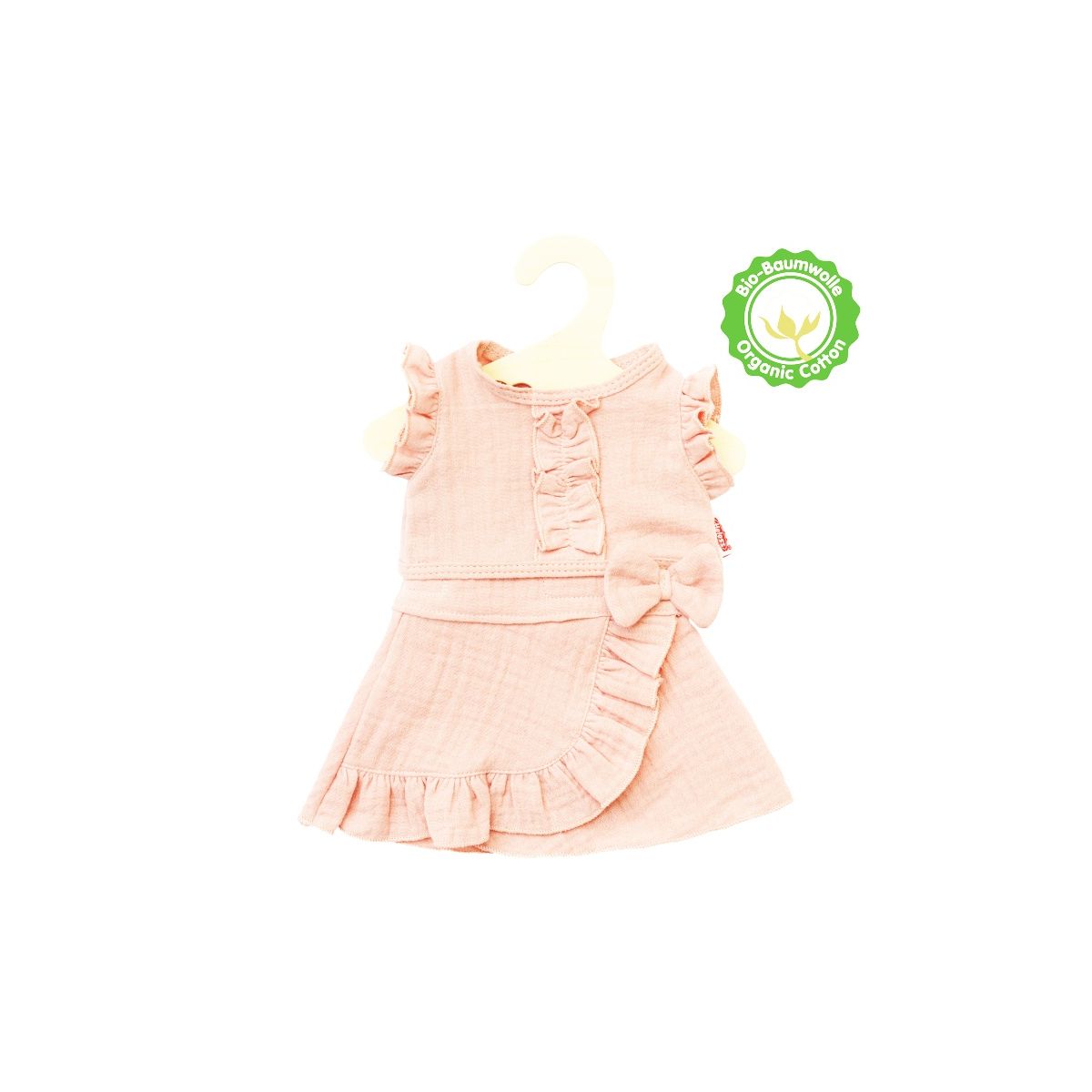 Der luftig-leichte Puppen-Wickelrock mit Rüschen-Top von Heless aus 100 % Bio-Baumwolle bietet Dir unbedenklichen und grenzenlosen Spielspaß mit Deiner Puppe. Das 2-teilige Outfit mit verspielten Details sieht nicht nur absolut bezaubernd aus, sondern verleiht ein durch und durch gutes Gefühl. Der weiche Musselinstoff in zartem Rosé stammt aus kontrolliert biologischem Anbau und schafft ein besonders behagliches und natürliches Spielerlebnis. Ein Puppenoutfit in liebevollem Design, das durch seine sanfte Farbe, höchste Qualität und niedliche Rüschenelemente besticht. Die Klettverschlüsse an Top und Rock sorgen dafür, dass das Puppenoutfit kinderleicht an- und ausgezogen werden kann. Das Kleid passt den meisten marktgängigen Puppen der Größe 28-35 cm. Es ist auch in einer weiteren Ausführung für Puppengröße 35-45 cm (Art.-Nr. 2423) erhältlich. Der Artikel wird auf einem Holzkleiderbügel geliefert..