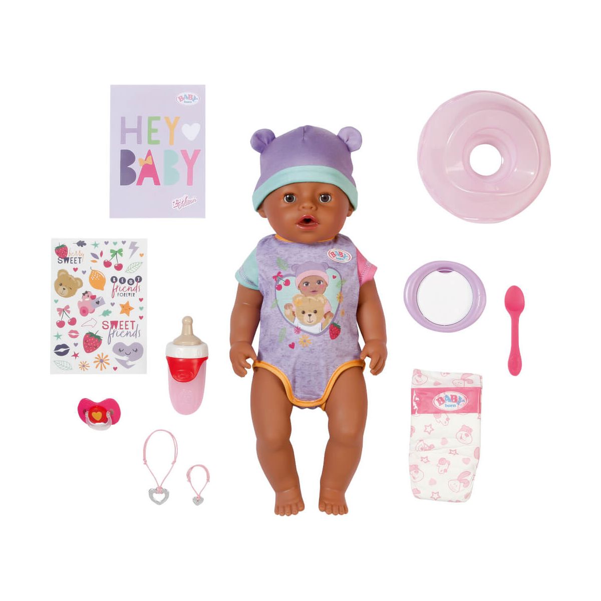 Hier kommt Eva! Bereits bekannt aus der BABY born Animationsserie, welche auf YouTube und Toggo zu sehen ist, gibt es Eva jetzt auch in ihrem neuen Outfit und mit 10 Accessoires für euch zu Hause. Mit dabei hat sie auch ihren magischen Teller: gibt man Wasser auf die Einlege- Fläche im Teller, erscheinen dort durch den Wasserzauber leckere Gerichte, die das Fütterspiel noch spannender machen. Setzt man sie nach dem gespielten Essen (mit Wasser) oder Trinken auf ihr Töpfchen und drückt ihr auf den Bauch, erscheinen auch dort ihr kleines und ihr großes Geschäft. Trinkt Eva Wasser aus ihrem Fläschchen, kann sie sogar weinen und muss behutsam getröstet werden. Dabei hilft der magische Schnuller: dreht man ihn um 180 Grad, schließen oder öffnen sich ihre Augen. Nochmal gedreht und das Gegenteil passiert. Legt man sie zum Schlafen ins Bettchen, schließt sie ihre Augen auch ohne Schnuller. Doch Eva kann noch viel mehr: Sie ist super beweglich und kann sogar mit in die Badwanne genommen werden, denn sie trocknet jetzt noch schneller: Um die Puppe nach dem Spiel richtig zu reinigen, kann das Bein entfernt werden, um eine größere Öffnung für die Reinigung zu schaffen. Wasser kann so viel einfacher abfließen. Für noch mehr kreatives Spiel bringt Eva neben ihrem Fläschchen, Schnuller, Teller, Löffelchen, Mahlzeiten und Töpfchen auch noch eine Windel, ihren Geburtspass und zwei Freundschaftsarmbändchen mit – für eine lange und liebevolle Freundschaft zwischen Kind und Puppe. In der gewohnten BABY born Qualität, die Generationen von Kindern seit 1991 begeistert. • Kann trinken, schlafen, weinen, baden und in die Windel machen • Durch den Fütterzauber erscheint ihr Lieblingsessen bei Wasserkontakt im Tellerchen • Auch das große und kleine Geschäft erscheinen auf magische Weise im Töpfchen • Schließt und öffnet die Augen mit Schnuller-Drehung • Mit 10 Accessoires