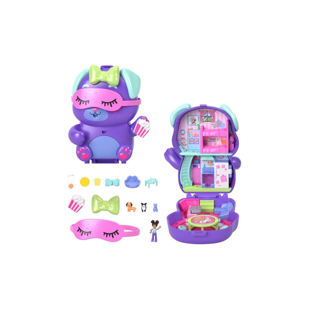 Diese Polly Pocket Übernachtungsparty-Welpen-Schatulle in Hündchenform kann außen niedlich dekoriert werden perfekt für Kinder, die gerne ihren einzigartigen Sinn für Mode zum Ausdruck bringen! Beim Öffnen der Schatulle beginnt die Übernachtungsparty und eine kleine Puppe mit 10 passenden Accessoires kommt zum Vorschein, darunter zwei süße Häschen. Die Shani-Puppe liebt es, sich das Hochbett mit ihrem süßen Hündchen zu teilen! Unten in der Küche sind leckere Snacks zu entdecken, und im Wohnzimmer warten Videospiele auf die Freunde. Nach dem Spielen können Kinder das Spielset ganz einfach zusammenpacken und mitnehmen! Ideal für Kinder ab 4 Jahren, insbesondere für all diejenigen, die Übernachtungspartys lieben! Alle Artikel separat erhältlich. Abweichungen in Farbe und Gestaltung vorbehalten..
