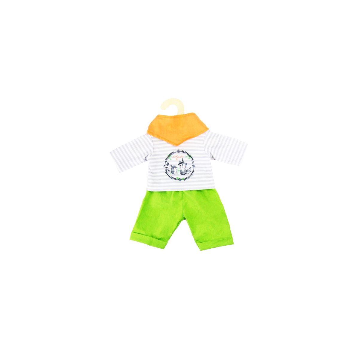 Im stylischen Outfit ?Foxy? von Heless machen Puppenjungs wie Puppenmädchen eine tolle Figur. Zur grünen Hose und trendigem Halstuch gehört ein Streifenshirt mit süßem Aufdruck des Fuchses ?Foxy? und seinen Waldfreunden. Ein durchgehender Klettverschluss am Rücken sorgt dafür, dass die Puppe kinderleicht an- und ausgezogen werden kann. So macht Puppenmode Spaß! Dieses Set passt den meisten marktgängigen Puppen der Größe 28-35 cm. Es ist auch in einer weiteren Ausführung für Puppengröße 35-45 cm erhältlich. Der Artikel wird auf einem Holzkleiderbügel geliefert..