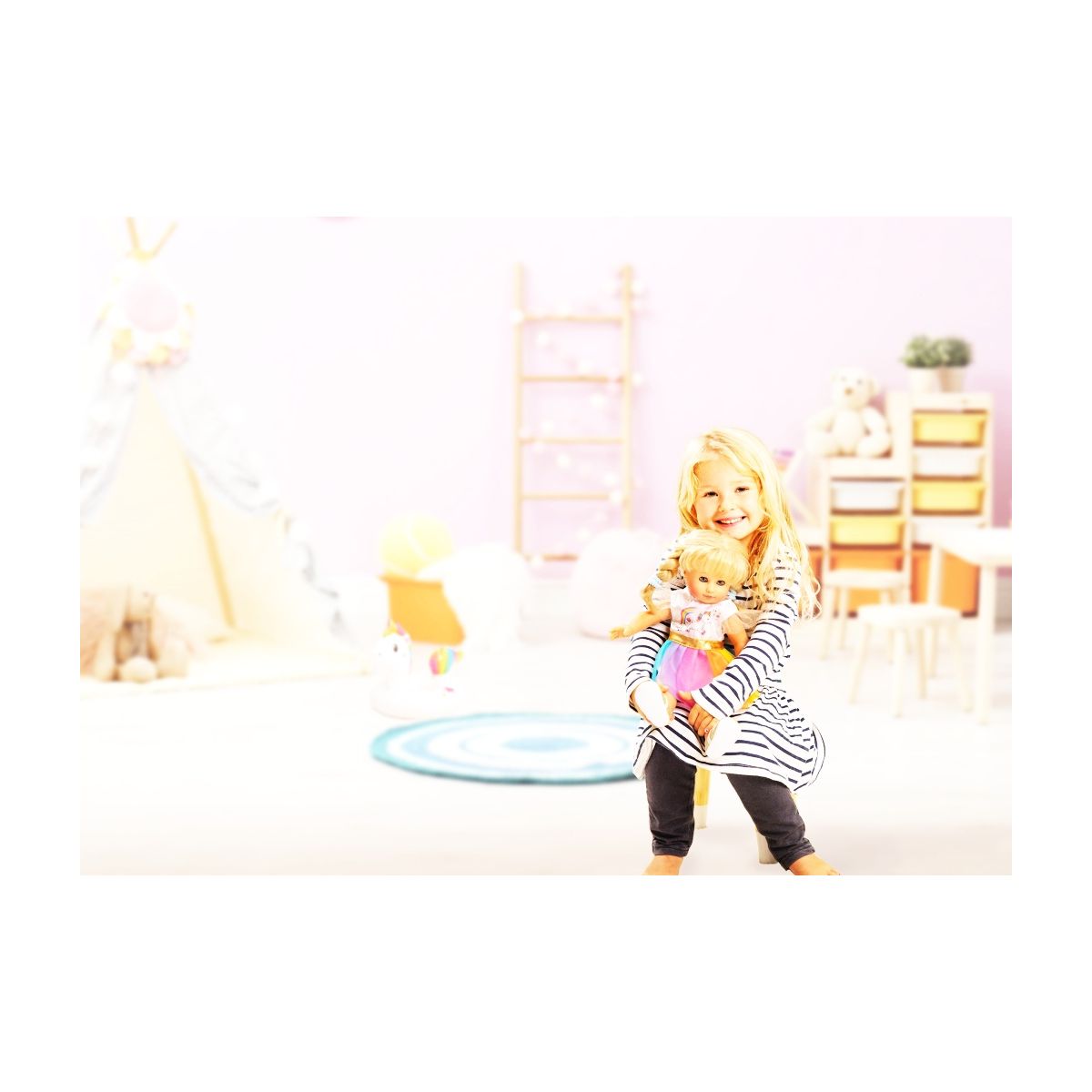 Das beliebte Einhorn-Kleid Henri von Heless lässt die Herzen aller Puppeneltern höher schlagen. Es wurde mit viel Liebe zum Detail entwickelt: Der prächtige, mehrlagige Tüllrock in Blütenform zeigt alle Regenbogenfarben, und auf der Brust findet sich das niedliche Einhorn Henri mit Regenbogen und bunten Sternchen wieder. Ein goldener Glitzergürtel und goldene Tüllrüschen an den Schultern machen das traumhafte Puppen-Outfit perfekt. Ein Must-have für den Puppenkleiderschrank, das den Einhorn-Trend perfekt ins Szene setzt. Durch raffinierte Materialien und einen Klettverschluss am Rücken ist es kinderleicht, das trendige Kleidchen seiner liebsten Puppe anzuziehen. Dieses Kleid passt den meisten marktgängigen Puppen der Größe 35-45 cm. Es ist auch in einer weiteren Ausführung für Puppengröße 28-35 cm erhältlich. Der Artikel wird auf einem Holzkleiderbügel geliefert..