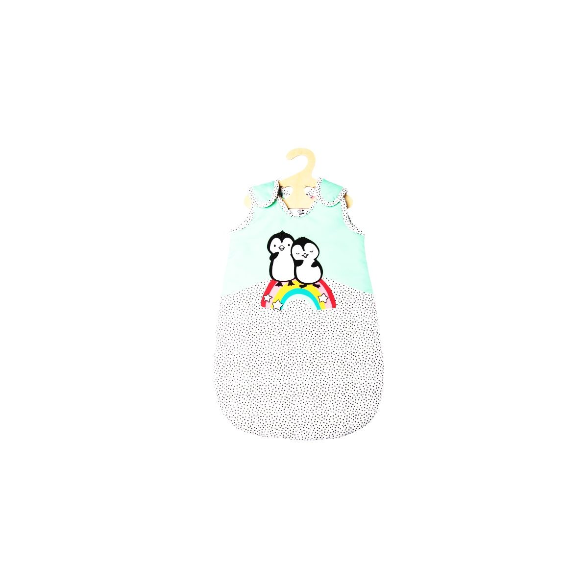 Schlaf, Püppchen, schlaf. Das Ins-Bett-bringen ist ein wichtiger Bestandteil beim Rollenspiel mit Puppen oder Kuscheltieren. Und hierfür benötigen Puppeneltern natürlich auch einen Schlafsack, in den sie ihr Baby gemütlich einkuscheln können. Im wattierten Puppenschlafsack der Pinguin Pünktchen-Serie von Heless schlafen Puppenbabys besonders sanft und weich. Und sehen dabei auch absolut niedlich aus: Der Mint-Ton im oberen Teil des Schlafsacks bietet einen tollen Farbkontrast zum weiß-schwarzen Punktedruck, auf dem der kleine Pinguin Pünktchen mit seiner Freundin auf einem Regenbogen sitzt. Die Klettverschlüsse des Schlafsacks lassen sich schnell und einfach öffnen und schließen - und machen das An- und Ausziehen somit zum Kinderspiel. Der Schlafsack passt den meisten marktgängigen Puppen der Größe 28-35 cm. Er ist auch in einer weiteren Ausführung für Puppengröße 35-45 cm (Art.-Nr. 2194) sowie 20-25 cm (Art.-Nr. 9194) erhältlich. Der Artikel wird auf einem Holzkleiderbügel geliefert..