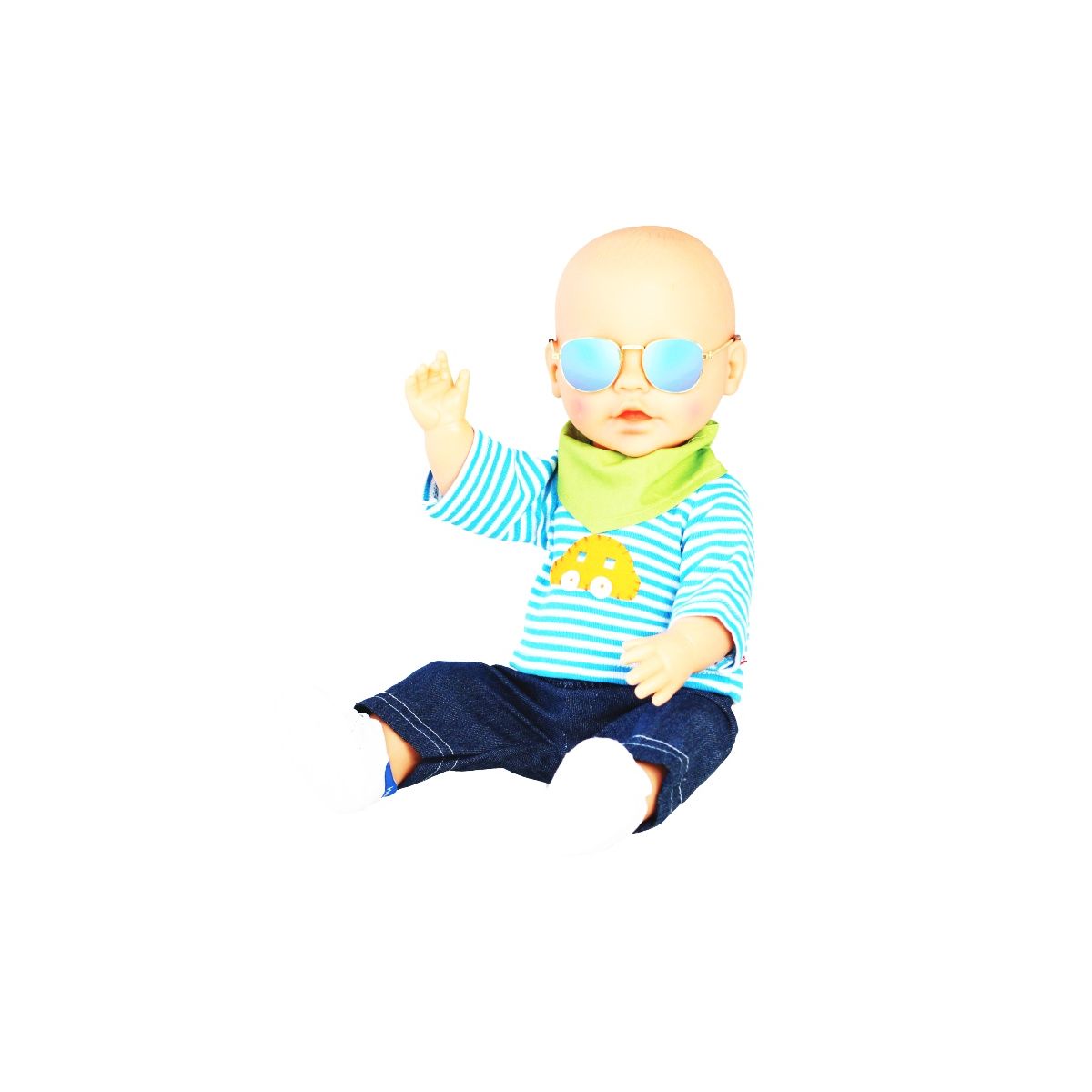 Auch Puppenjungs kommen bei Heless nicht zu kurz! Dieses freche Bekleidungsset besteht aus einer coolen Jeans, einem blau-weißen Streifen-Shirt mit toller Auto-Applikation und einem grünen Halstuch. Ein Outfit in toller Farbkombination, das jeder Jungs-Puppe gute Laune macht und sich mit vielen weiteren Kleidungsstücken kombinieren lässt. Dieses Set passt den meisten marktgängigen Puppen der Größe 28-35 cm. Es ist auch in einer weiteren Ausführung für Puppengröße 35-45 cm erhältlich. Der Artikel wird auf einem Holzkleiderbügel geliefert..