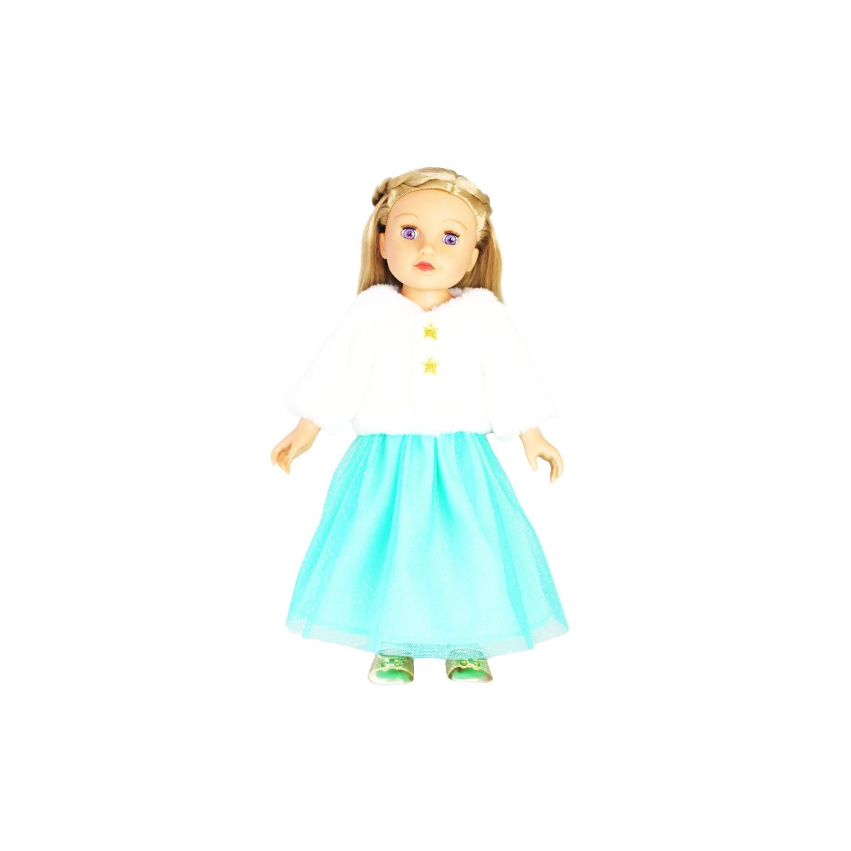 Gehüllt in die bezaubernde Puppen-Plüschjacke ?Yuki? mit langem Glitzer-Tüllrock von Heless fühlt sich jede Puppe wie eine echte Schneeprinzessin. Die weiße flauschige Plüschjacke mit aufgestickten Goldsternen hält wunderbar warm und sieht dabei extrem cool aus. Der voluminöse Tüllrock in kräftigem Mintgrün setzt mit goldenen Pünktchen wunderschöne Glitzerakzente. Der Klettverschluss der Jacke und der elastische Rockbund sorgen dafür, dass dieses Outfit kinderleicht an- und ausgezogen werden kann. Ein kuscheliges und glamouröses Puppenkleidungsset für die kalte Jahreszeit. Beide Teile lassen sich aber auch super mit anderen Kleidungsstücken der Heless-Kollektion kombinieren, so dass sie das ganze Jahr über einen perfekten Look bieten. Dieses Bekleidungsset passt den meisten marktgängigen Puppen der Größe 35-45 cm. Es ist auch in einer weiteren Ausführung für Puppengröße 28-35 cm (Art.-Nr. 1370) erhältlich. Der Artikel wird auf einem Holzkleiderbügel geliefert..