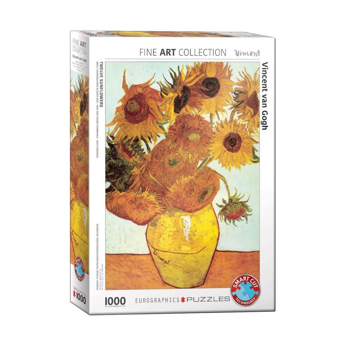 EuroGraphics Zwölf Sonnenblumen in einer Vase von Vincent van Gogh 1000-Teile Puzzle. Verpackungsabmessungen 35 x 25 x 6 cm. Abmessungen des zusammengebauten Puzzles 48 x 68 cm. Van Gogh malte ''Zwölf Sonnenblumen'' in Arles in 1888. Der kühle Hintergrund dieses Bildes lässt die dadurch leuchtend wirkenden Sonnenblumen an ihre Bedeutung erinnern. Ebenfalls durch die Perfektion der gelben Blüten, im Gegensatz zu der einfach und unscheinbar geschaffenen Umgebung, wirkt das Bild hell und freundlich. Speziell entwickelte Pappe mit wiederstandsfähiger Leinenstruktur für einen noch besseren Zusammenhalt der Teile.