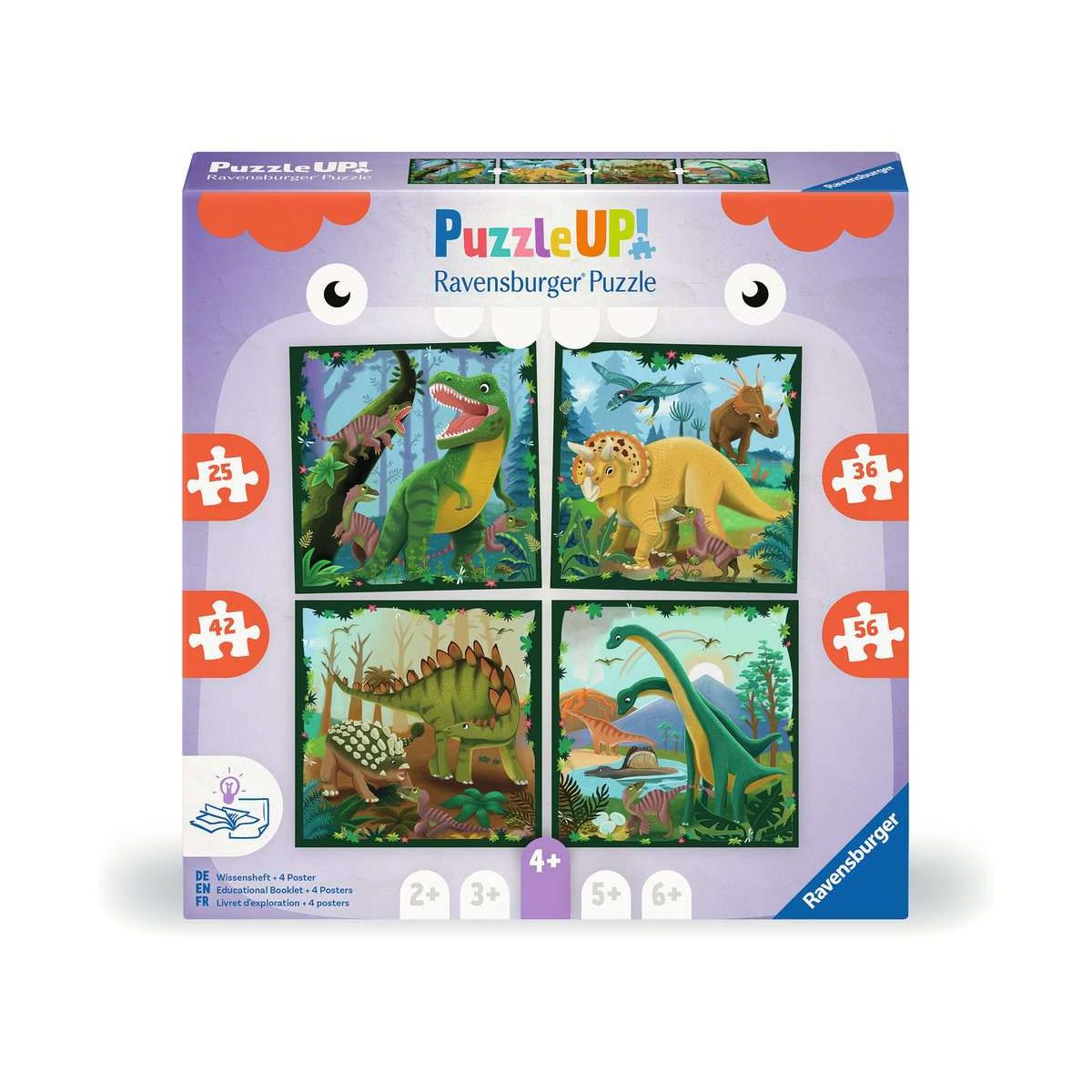 Die Puzzlebilder zeigen die beliebtesten Dinosaurier und im Wissensheft gibt es spannende Informationen dazu. Am Ende ergeben die 4 Puzzles ein großes Gesamtbild, sie können als Quadrat oder in einer Reihe angeordnet werden.Puzzeln ist eine tolle Beschäftigung für Kinder, denn es schult die Wahrnehmung und die Auge-Hand-Koordination, es schafft Erfolgserlebnisse und regt die Fantasie an. Die Reihe Puzzle UP! richtet sich an Kinder zwischen 2 und 6 Jahren und ist optimal auf das Können der jeweiligen Altersgruppe angepasst. Jedes Puzzle UP enthält mehrere Puzzles mit ansteigender Teilezahl. Das sorgt für Abwechslung und motiviert dazu, seine Fähigkeiten beim Puzzeln zu verbessern. Die liebevoll illustrierten Puzzlemotive passen perfekt zusammen und lassen sich zu einem großen, wunderschönen Gesamtbild vereinen. In einem Wissensheft erfahren Kinder Interessantes und Wissenswertes über die Puzzlebilder..