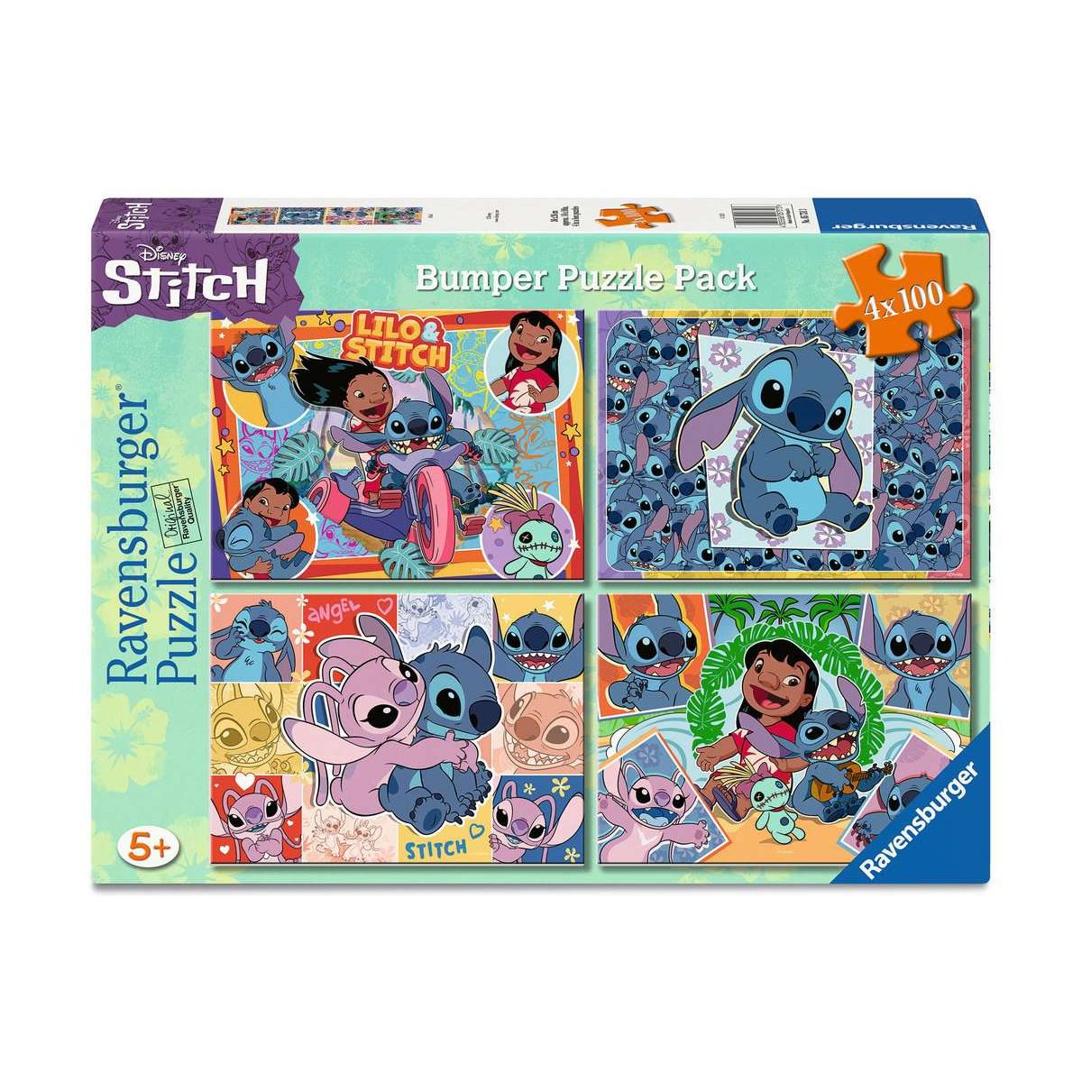Hier steckt mehr drin! 4 Puzzles mit jeweils 100 Teilen: Vierfacher Puzzlespaß für Kinder ab 5 Jahren. Unsere Puzzles werden in exzellenter Verarbeitungsqualität mit Material aus nachhaltiger Forstwirtschaft gefertigt. Stück für Stück entstehen 4 wunderschöne Motive mit Stitch aus dem bekannten Disney-Abenteuer ''Lilo Stitch''. Beim Puzzeln können Kinder in fantastische Welten eintauchen und dabei spielerisch Konzentration und Feinmotorik trainieren. Teile suchen, anfügen und sich über das immer größer werdende Bild freuen – Puzzeln ist, wenn sich ein Erfolg an den anderen reiht. Deshalb lieben Kinder es, die Puzzleteile immer wieder zu ihren Lieblingsmotiven zusammen zu setzen. Doch Puzzles bieten mehr als Spaß: Mit der richtigen Schwierigkeit gewählt, lassen sie Kinder jeden Alters an den Herausforderungen wachsen, erhöhen ihre Geduld und stärken ihr Selbstvertrauen. In der großen Auswahl von Ravensburger Kinderpuzzles mit den beliebtesten Motiven, von 2 Teilen bis 300 Teilen, ist garantiert für jedes Kind das Richtige dabei. Die Auswahl der Motive und die hohe Qualität unserer Kinderpuzzles liegen uns sehr am Herzen. Seit mehr als 100 Jahren entwickeln wir Puzzles, wie Kinder sie lieben: altersgerecht in Motiv, Teilezahl und -größe..