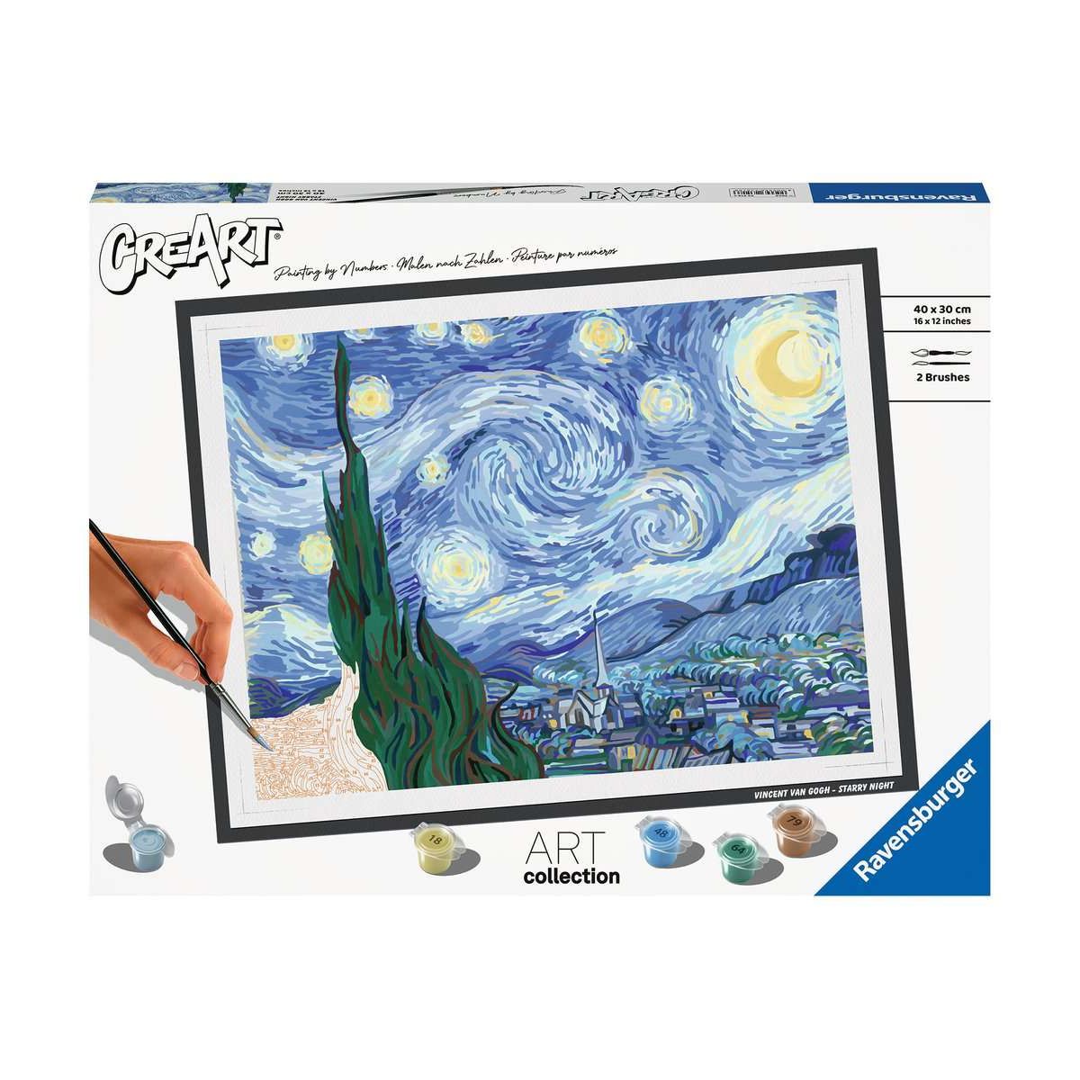 Mit CreArt - Malen nach Zahlen von Ravensburger findest du den Weg zur inneren Ruhe und Entspannung. Male weltbekannte Motive aus dem Museum: Das bekannte Gemälde Starry Night (Sternennacht) gibt es jetzt als CreArt- Malen nach Zahlen bei Ravensburger. Das ist Malspaß mit Erfolgsgarantie für einen einzigartigen Wandschmuck für das eigene Zuhause oder zum Verschenken. Die Motivlinien sind bereits aufgedruckt und nummeriert und werden mit den bereits fertig gemischten Acrylfarben ausgemalt. So einfach war malen noch nie!Der niederländische Maler Vincent van Gogh malte das Kunstwerk im Jahr 1889 in der südfanzösischen Kleinstadt Saint Remy de Provence im Stil des Post Impressionismus bzw. frühen Expressionismus. Das turbulente Leben des Malers beeinflusste seine Bilder stark. Er machte vor allem die Welt der einfachen Menschen, also Bauern und Handwerker, zu seinen Motiven. Diese malte er spontan, schnell und ohne anschließende Korrekturen. Vincent van Goghs Werke wurden unmittelbar nach seinem Tod berühmt.Alles, was du brauchst in einem Set, so kannst du auspacken und direkt losmalen: Die Motivlinien sind bereits aufgedruckt und nummeriert und werden mit den bereits fertig gemischten Acrylfarben ausgemalt. Jedes Set enthält eine stabile Maltafel aus Karton, hochwertige Pinsel aus Holz, eine Malvorlage sowie alle benötigten Acrylfarben. Die Farben sind fertig gemischt und kommen in wiederverschließbaren Töpfchen, um ein Austrocknen zu verhindern..