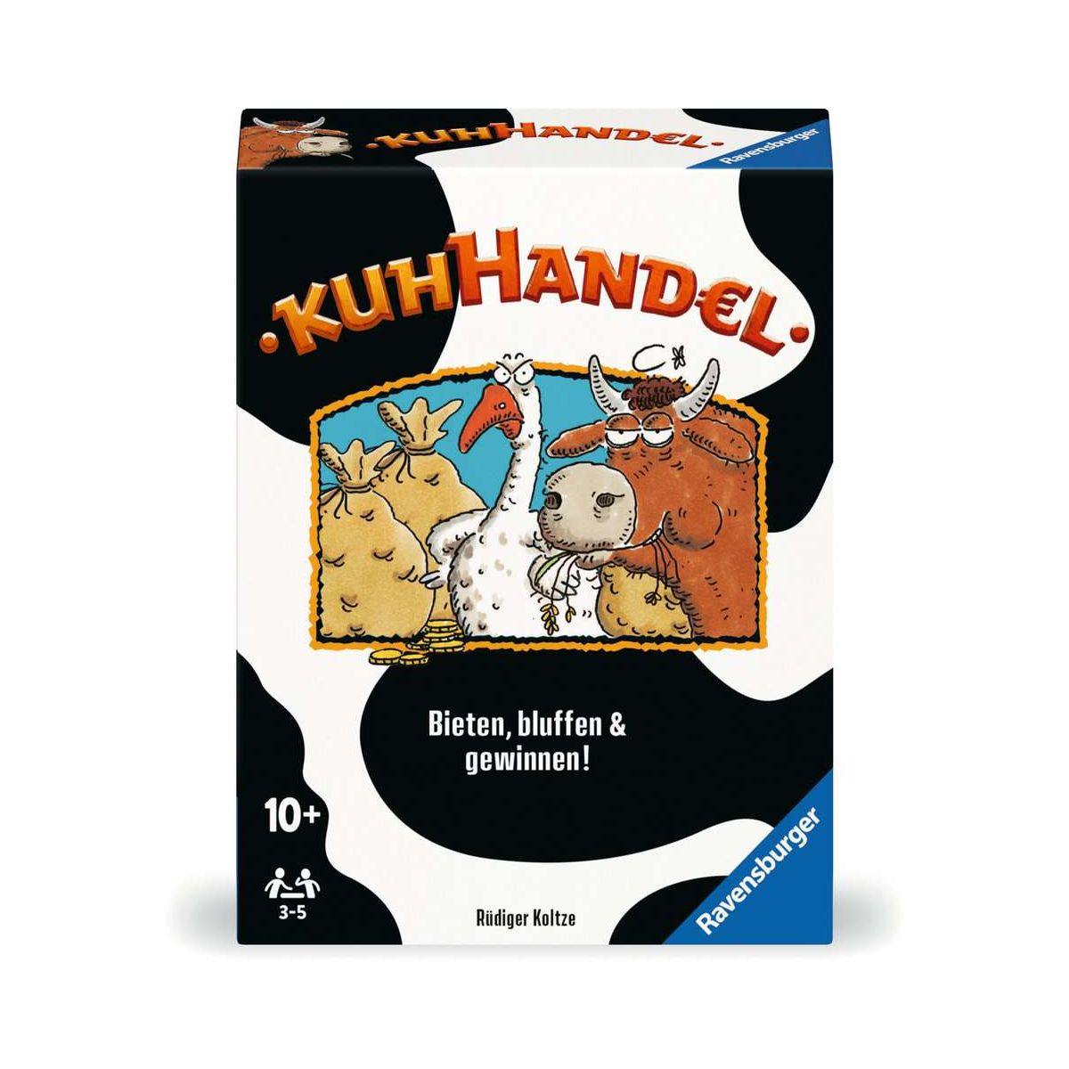 3,2,1 ? verkauft! Wer bietet am meisten? Und wer zieht seine Mitspieler so richtig über den Tisch? Nur wenn die Spieler im richtigen Moment steigern, sichern sie sich die dicksten Viecher und damit die meisten Punkte. Geld ist am Ende nichts mehr wert. Bei Spielbeginn fängt der Spieler mit dem schwersten Haustier an. Danach läuft das Spiel reihum. Wer an der Reihe ist, entscheidet sich entweder für Versteigerung oder Kuhhandel.Anschließend ist der nächste Spieler an der Reihe. Er entscheidet sich wiederum für eine der beiden Aktionen etc.Das Kartenspiel für 3-5 Spieler ist kurzweilig, macht jede Menge Spaß. Es ist durch das praktische Reiseformat super zum Mitnehmen geeignet. Auch perfekt für jeden Spieleabend mit der Familie oder Freunden. Außerdem ist Kuhhandel auch ein tolles Geschenk für Kinder und Erwachsene ab 10 Jahren zu Anlässen wie Weinachten, Geburtstag oder Ostern..