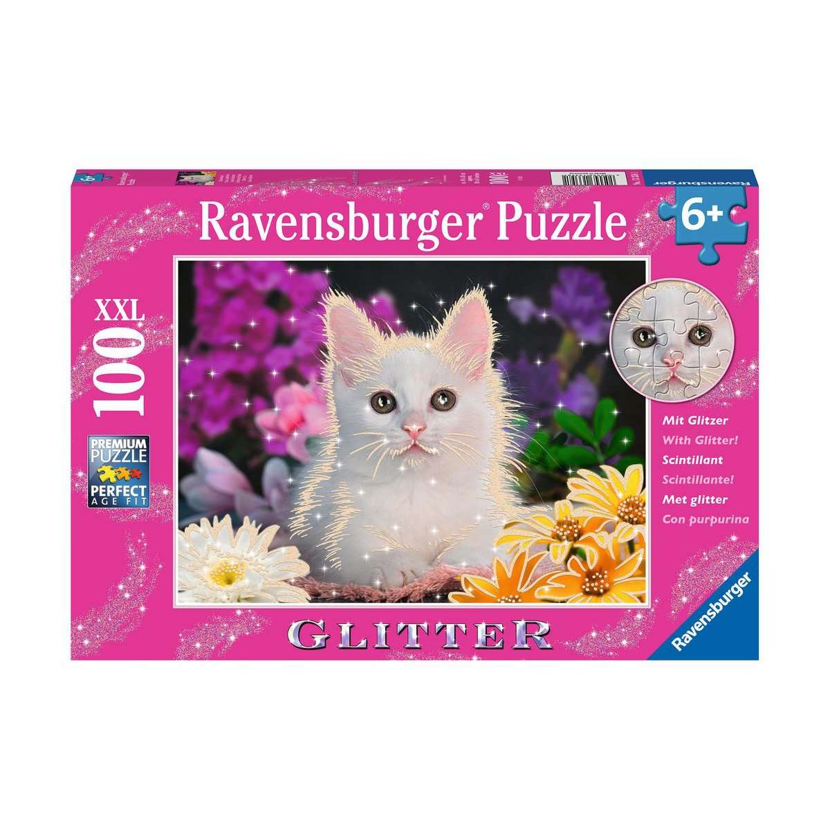 Glitzernder Puzzlespaß im XXL-Format! Die Ravensburger Glitterpuzzles sind ganz besondere Puzzles: Wie von zauberhaftem Feenstaub überzogen funkeln und glitzern liebevolle Details der Glitter-Puzzle-Motive und begeistern kleine Puzzlerinnen und Puzzler. Die Glitzerpuzzles mit 100 Teilen im XXL-Format sind ideal für Mädchen und Jungen ab 6 Jahren und sorgen für ein schimmerndes Puzzlevergnügen!Teile suchen, anfügen und sich über das immer größer werdende Bild freuen - Puzzeln ist, wenn sich ein kleiner Erfolg an den anderen reiht. Deshalb lieben Kinder es, die Puzzleteile immer wieder zu ihren Lieblingsmotiven zusammen zu setzen. Doch Puzzles bieten mehr als Spaß: Mit der richtigen Schwierigkeit gewählt, lassen sie Kinder jeden Alters an den Herausforderungen wachsen, erhöhen ihre Geduld und stärken ihr Selbstvertrauen. Die Auswahl der richtigen Motive und die hohe Qualität unserer Kinderpuzzles liegen uns sehr am Herzen. Deshalb wird die Unbedenklichkeit aller Materialien sowie des Glitzerlacks von einem unabhängigen Institut bestätigt. Seit mehr als 100 Jahren entwickeln wir Puzzles, wie Kinder sie lieben: altersgerecht in Motiv, Teilezahl und -größe..