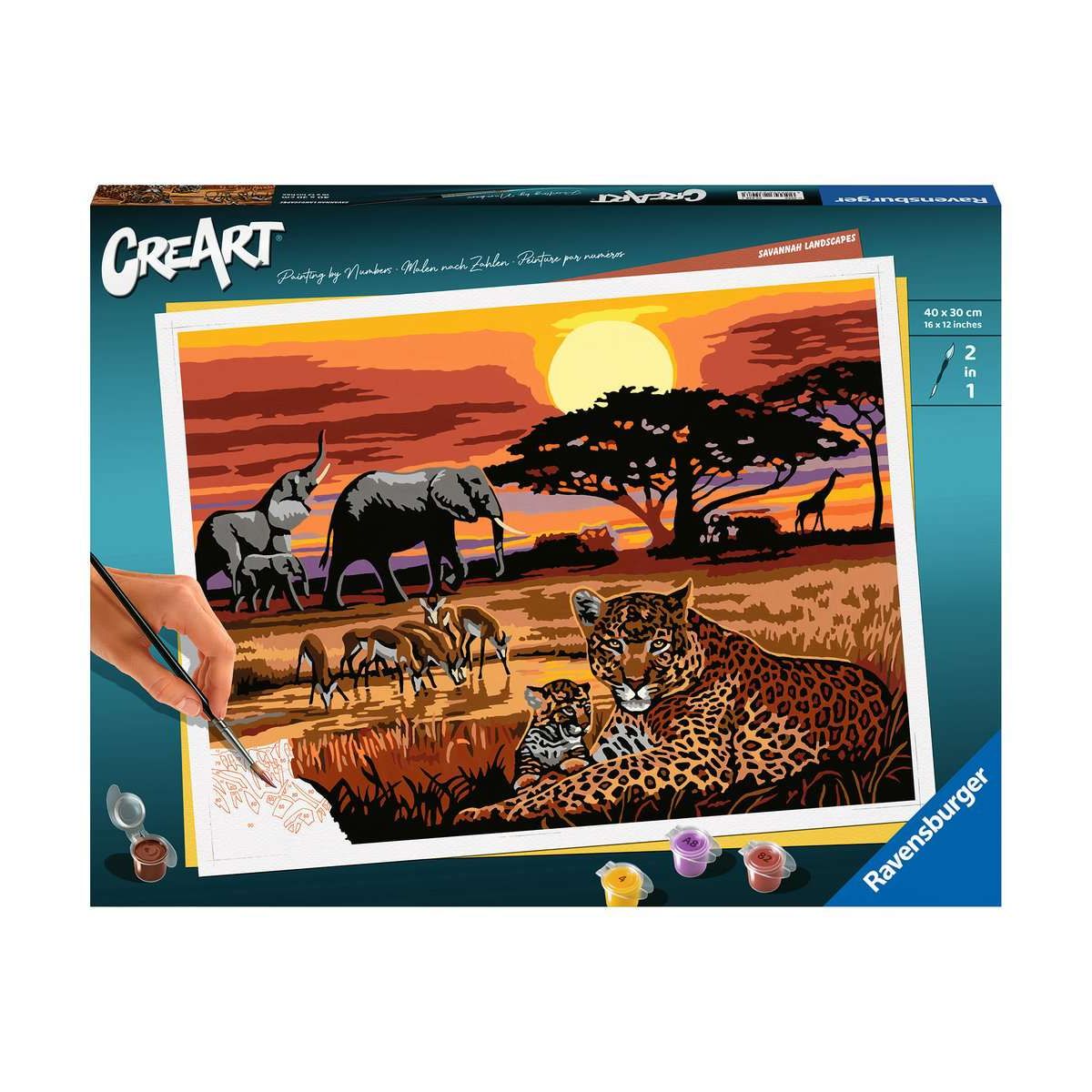 Das schöne CreArt Premium Motiv Savannenlandschaft von Ravensburger sorgt für großartigen Malspaß für Erwachsene ab 14 Jahren und pure Entspannung. Die Motivlinien sind bereits aufgedruckt und nummeriert und werden mit den bereits fertig gemischten Acrylfarben ausgemalt. Das ist Malspaß mit Erfolgsgarantie für einen einzigartigen Wandschmuck für das eigene Zuhause oder zum Verschenken. So einfach war malen noch nie!Mit CreArt - Malen nach Zahlen von Ravensburger den Weg zur inneren Ruhe und Entspannung finden und sich beim genauen Ausmalen in entfernte Städte und Landschaften träumen.Einfach auspacken und los malen: jedes Malset enthält alles, was zum Malen benötigt wird und es ist kein Mischen der Farben notwendig.Das Ravensburger CreArt - Malen nach Zahlen Programm bietet eine große Motivauswahl für Kinder und Erwachsene..