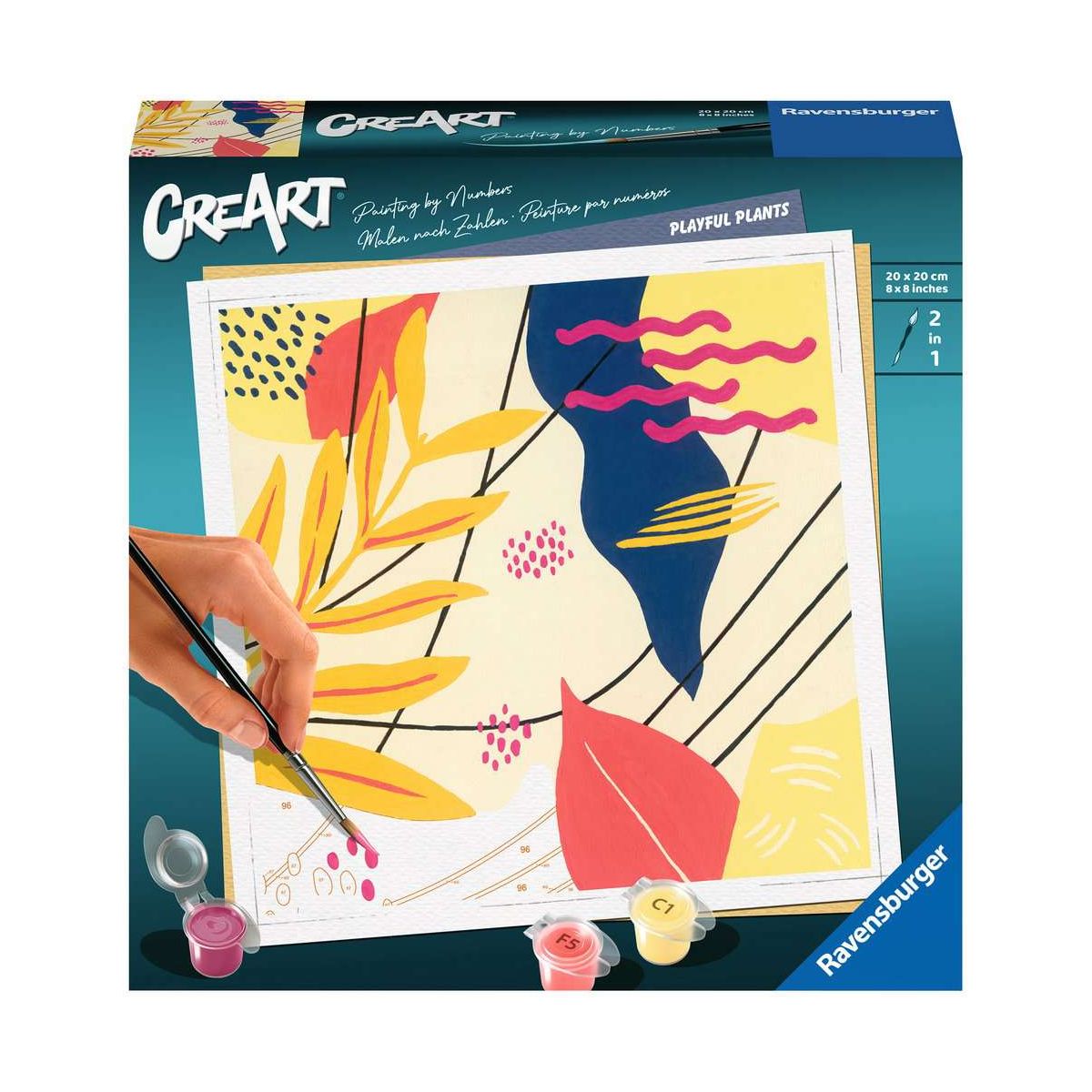 Coole Motive, leuchtende Farben und glänzender Lack für ein perfektes Finish. Das trendige Motiv Verspielte Pflanzen sorgt für großartigen Malspaß für Erwachsene ab 12 Jahren. Die Motivlinien sind bereits aufgedruckt und nummeriert und werden mit den fertig gemischten Acrylfarben ausgemalt. Das ist Malspaß mit Erfolgsgarantie für einen einzigartigen Wandschmuck. So einfach war malen noch nie!Mit CreArt - Malen nach Zahlen von Ravensburger den Weg zur inneren Ruhe und Entspannung finden. Einfach auspacken und los malen: jedes Malset enthält alles, was zum Malen benötigt wird und es ist kein Mischen der Farben notwendig. Das fertig gemalte Bild eignet sich als trendige Dekoration in jedem Zuhause. Das Ravensburger CreArt - Malen nach Zahlen Programm bietet eine große Motivauswahl für Kinder und Erwachsene..