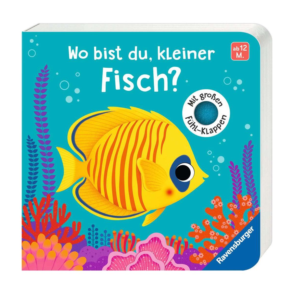 Hier im Meer so leben viele bunte Tiere! Aber einige davon haben sich gut versteckt, so wie der kleine Fisch. Bereits kleine Kinderhände öffnen spielend leicht die stabilen, speichelfesten Fühlklappen aus dickem Stoff und finden es heraus. Ein kurzes Frage-Antwort-Spiel weckt dabei die Neugier der Kleinsten und unterstützt spielerisch beim Sprechenlernen.Wo hat sich der kleine Fisch versteckt? Ist er in der Schatzkiste? Oder hat er es sich in der großen Muschel gemütlich gemacht? Dieses allererste Stoff-Klappenbuch lädt Kinder ab 12 Monaten ein, es herauszufinden!Auf jeder der fünf Doppelseiten gibt es eine große Klappe aus Stoff, die zum Greifen und Entdecken anregt. Schon die Allerkleinsten öffnen diese Klappen spielend leicht ? stabile Materialien und das handliche Buchformat machen es möglich. Dahinter verstecken sich allerlei bunte Tiere: Ein Oktopus, eine Krabbe, die Schildkröte und Seepferdchen. Und wo ist der kleine Fisch? ? Ah, bei seinen Freunden!Dieses Pappbilderbuch ist auf die Bedürfnisse kleiner Kinderhände abgestimmt und hält auch energischen Griffen stand. So kann sich die Feinmotorik Schritt für Schritt entwickeln.Dank der kompakten Maße passt das Buch zudem in jede Hand- und Wickeltasche, ideal für unterwegs!.