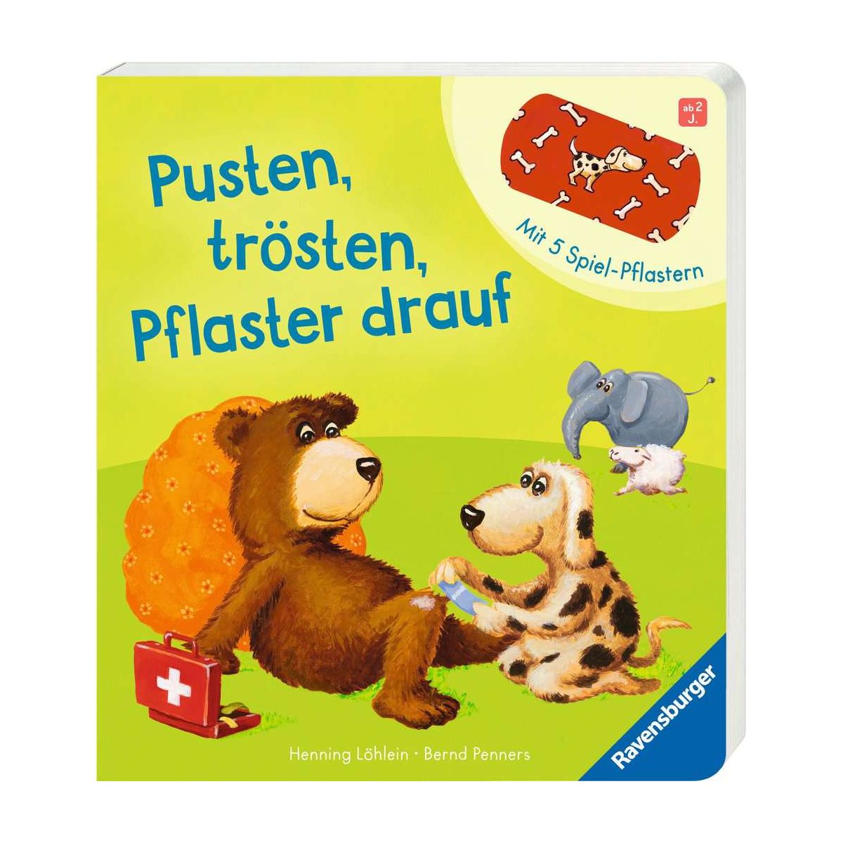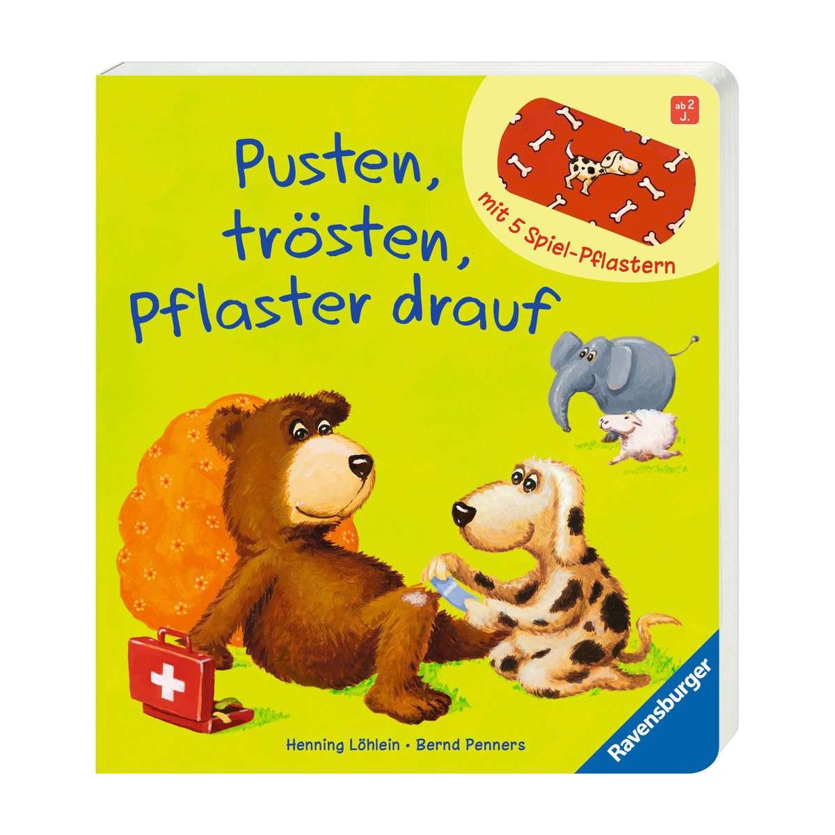 Dem Hund tut seine Pfote weh, das Affenkind hat eine Beule, das Schaf einen Kratzer am Bauch, der Elefant einen platten Rüssel und der Bär hat sich auf einen spitzen Ast gesetzt. Aua, das tut weh. Da ist ein Pflaster genau das Richtige! Schnell, pusten, trösten Pflaster drauf! So werden die Tiere schnell wieder gesund.Ein interaktives Spielbuch mit fünf abwaschbaren und immer wieder verwendbaren Spiel-Pflastern und wiederkehrenden Reimen.Na so etwas!Der kleine Elefant, oh Schreck!, der lief vor einem Mäuschen weg. Und dabei trat er sich doch glatt mit einem Fuß den Rüssel platt.Auch die anderen Tiere haben sich wehgetan: Der Hund ist umgeknickt, das Affenkind schwang sich gegen einen Baum, das Schaff verletzte sich an einem Dornenstrauch und dem Bären tut der Po weh. Auwei! Und was hilft den Tieren jetzt? ? Schnell pusten, trösten, Pflaster drauf! Dann hör?n die Schmerzen wieder auf.Auf sieben Doppelseiten erzählen kleine Bildergeschichten, was den Tieren genau passiert ist. Lustige Reime animieren Kinder ab 2 Jahren dann dazu, das auf der rechten Buchseite groß abgebildeten Tier zu trösten und es mit einem der bunten Spiel-Pflaster zu verarzten. Bald ist alles wieder gut!Die extra dicken Spiel-Pflaster haften auf allen glatten Oberflächen und lassen sich rückstandsfrei auch von kleinen Kinderhänden immer und immer wieder ablösen und neu aufkleben. Bei Verschmutzung einfach unter kaltem Leitungswasser abwaschen, trocknen lassen und schon kann der Stickerspaß weitergehen..