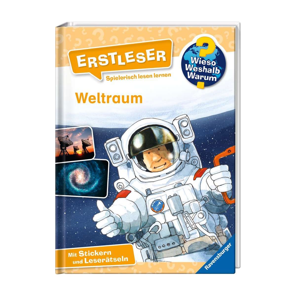 Ferne Galaxien, explodierende Sterne und schwarze Löcher ? die unendlichen Weiten des Universums bergen jede Menge Geheimnisse. Diesen gehen Erstleser im Buch ganz selbständig auf den Grund: Woraus bestehen Planeten? Was ist ein Komet? Wie gelangen Astronauten zur Raumstation? Leicht verständliche Texte, anschauliche Illustrationen und Fotos helfen beim Lesen lernen. Und für jede Menge Spaß sorgen zusätzlich Sticker, ein Spiel und viele Rätsel.Wieso? Weshalb? Warum? ErstleserDie Sachbuchreihe für Kinder ab der 2. Lesestufe Lesetraining, Sachwissen und Spielspaß in einem!Mit der Reihe Wieso? Weshalb? Warum? Erstleser erschließen sich Kinder ihre Lieblingsthemen selbst. In vier Kapiteln beantworten die Bücher brennende Kinderfragen in kurzen, leicht verständlichen Sätzen. Wie lebt man auf einer Raumstation? Welche Sprache sprechen Wale? Wie gefährlich ist ein Vulkan? Illustrationen und Fotos helfen den Kindern dabei, das Gelesene zu verstehen.Zusätzlich gibt es am Ende jedes Kapitels Buchstaben- und Kreuzworträtsel, Suchbilder, Sudokus und vieles mehr. Ganze acht Seiten mit unterschiedlichsten Rätseln und ein Lesequiz laden zum Knobeln ein. Ein Leselotto-Spiel hilft beim Verständnis schwieriger Wörter. Auf einer Stickerseite zeigen Texte, wo welcher Aufkleber hingehört. Spielerisch lesen lernen wird hier großgeschrieben..
