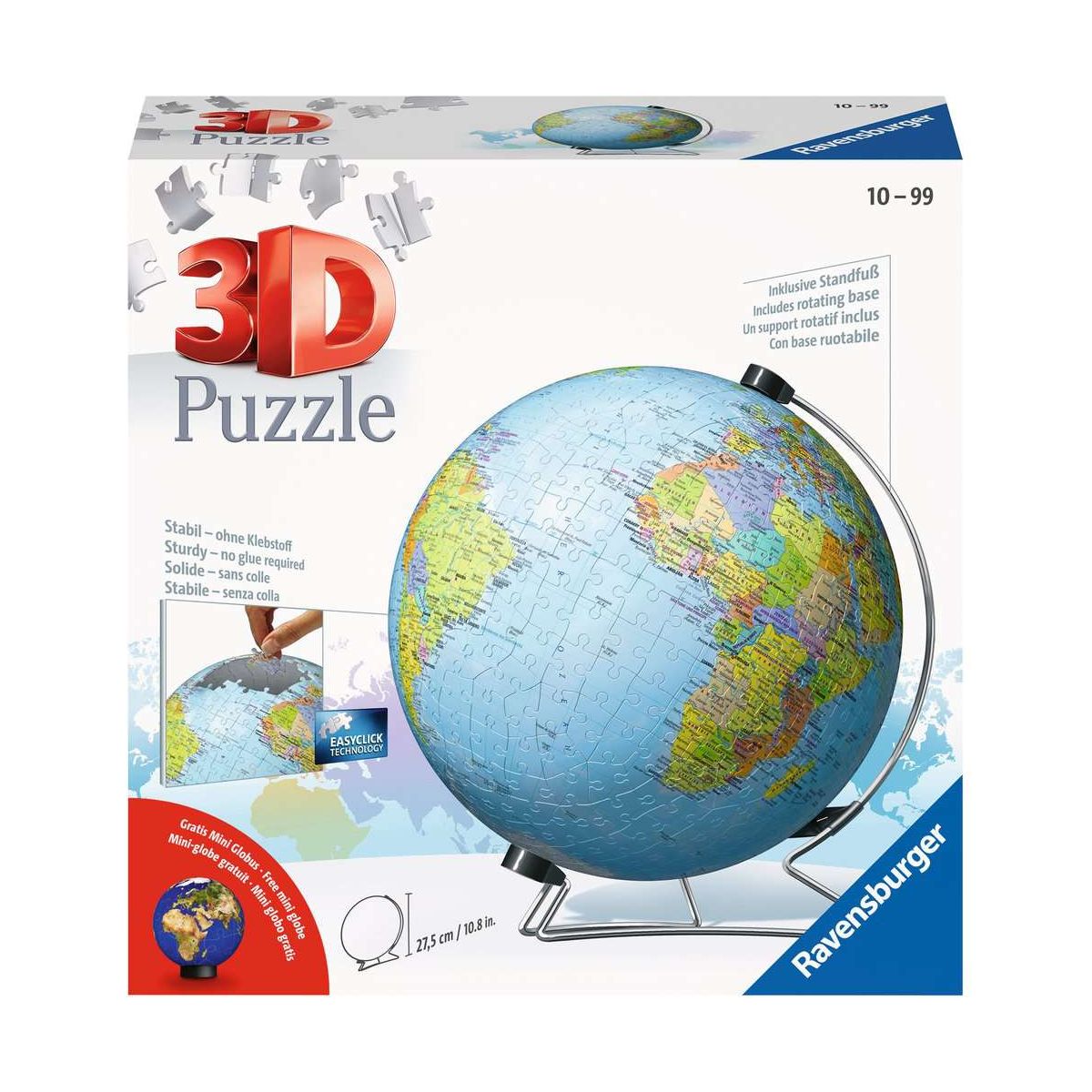 3D Puzzle GlobusHolen Sie sich die Welt nach Hause!Drehen Sie die Welt, wie Sie Ihnen gefällt ? dieser Globus ist dafür gemacht! Träumen Sie sich in ferne Länder oder suchen Sie Ihr nächstes Urlaubsziel, studieren Sie die Kontinente oder tauchen Sie in die Weltmeere ein. Was auch immer Sie vorhaben, jetzt können Sie zuhause ?weltenbummeln!Einmal rund um den Globus reisen ? eine Vorstellung, die Träume weckt und mit diesem 3D Puzzle endlich Wirklichkeit werden kann. Dabei zeigt der 3D- Globus nicht allein Länder und Kontinente, die politische Weltkarte bringt mit ihrem hohen Informationsgehalt einen zusätzlichen edukativen Mehrwert mit sich. Die 540 gewölbten Puzzleteile passen dank EasyClick Technology perfekt zusammen und formen ganz ohne Kleben eine stabile Weltkugel. Das bedeutet: Hier ist für Puzzlefreunde von 10 bis 99 Jahren einzigartiger Puzzlespaß vorprogrammiert ? der mithilfe einer bebilderten Anleitung zur unbeschwerten Freude wird. Ideal für zwischendurch oder zum Verschenken eignet sich der beiliegende 27 Teile Mini-Globus.Ergänzendes Zubehör vervollständigt das dekorative Objekt, das vor allem durch seinen praktischen Drehfuß immer wieder zum perfekten Ausflugsziel für wissensdurstige Weltenbummler wird..
