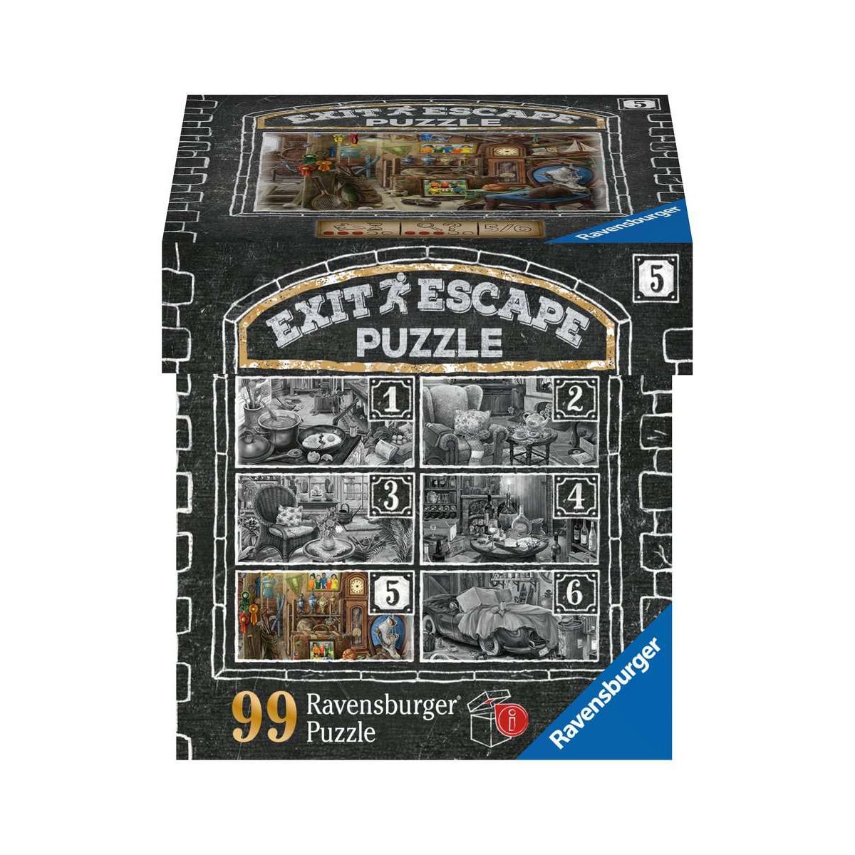 EXIT Puzzle von Ravensburger! Puzzeln, Rätseln, Lösen. Gelingt es, die Puzzleteile an ihren Platz zu legen, die Rätsel zu finden und sie zu knacken? Verschiedene Schwierigkeitslevel der Puzzles garantieren ein abwechslungsreiches Puzzle- und Rätselvergnügen! In der Schachtel befindet sich ein Puzzle mit 99 geheimnisvollen Teilen. Die dazugehörige Anleitung sowie die Lösung können online eingesehen werden.Jetzt gibt es das Konzept der EXIT Rooms auch als Ravensburger Puzzle! Frei nach dem Motto: Puzzeln, Rätseln, Lösen. Gelingt es, die Puzzleteile an ihren Platz zu legen, alle Rätsel zu finden und sie mit hinreichender Kombinationsgabe zu knacken? Die spannende Mission um das Gutshaus lässt Puzzler und Spieler in die geheimnisumwobene Welt des EXIT Puzzles eintauchen, in der es den EXIT zu finden gilt! Gelingt dies, kann man mit Stolz behaupten seine Mission mit Bravour gemeistert zu haben. Verschiedene Schwierigkeitslevel der Puzzles garantieren dabei abwechslungsreiches Puzzle- und Rätselvergnügen! In der Schachtel befindet sich ein Puzzle mit 99 geheimnisvollen Teilen. Die dazugehörige Anleitung sowie die Lösung können online eingesehen werden..