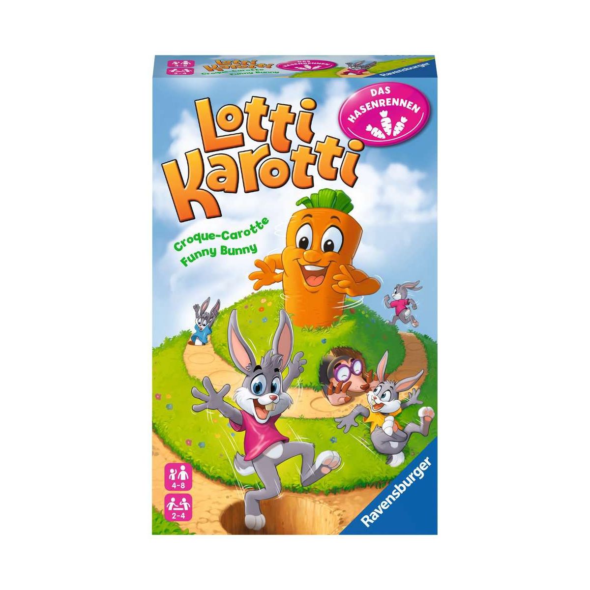 Acht kleine Hasen starten zum spannenden Wettrennen zur Karotte. Wie weit sie hüpfen dürfen, bestimmt das Glücksrad, das die Spieler in jedem Zug drehen: Landen sie bei ihrer Aktion auf einem sicheren Feld oder ? hoppla ? in einem gefährlichen Loch? Der kleine Maulwurf schubst einen beliebigen Mitspieler ein Feld zurück und wer eine Brücke vor sich liegen hat, darf eine Abkürzung nehmen. Es bleibt spannend bis zum Schluss, welcher der Hase als Erster am Ziel bei der Karotte ankommt!Dieses Hasenrennen ist ein Gesellschaftsspiel, das nicht nur Lotti Karotti Liebhaber ab 4 Jahren, sondern die ganze Familie begeistert. Jeder Spieler geht mit zwei Hasen seiner Lieblingsfarbe an den Start. Der Spieler am Zug dreht das Glücksrad und darf die gedrehte Aktion ausführen.Mal zieht der Spieler mit einem seiner Hasen die gedrehte Anzahl an Feldern voran. Zeigt der Pfeil auf einen Maulwurf, darf man den Hasen eines Mitspielers ein Feld zurücksetzen. Manchmal fällt dabei dessen Hase in ein Loch und beginnt wieder von vorn - so ein Pech! Mit einem Brett kann ein offenes Loch wieder begehbar gemacht werden - oder man sogar den Weg abkürzen, indem man eine Brücke repariert. So bleibt es spannend bis zum Schluss, bis der erste Hase direkt auf dem Zielfeld bei der Karotte angekommen ist..