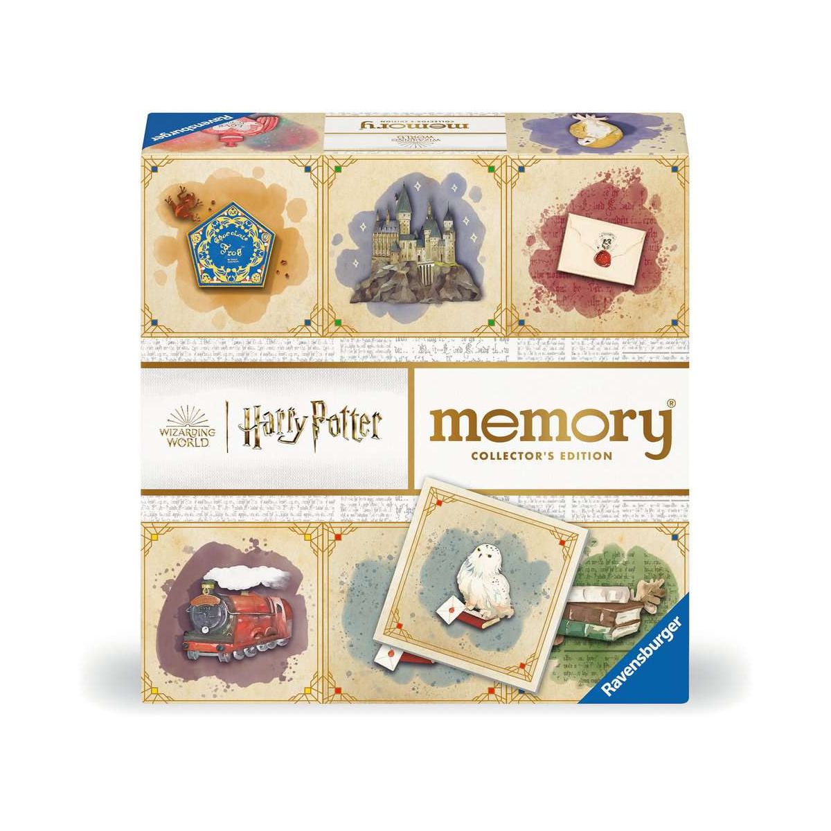 Dieses memory® lädt zu einer Reise in die magische Welt von Hogwarts ein! Die Motive sind illustriert und mit Leuchtfarbe veredelt, sodass sich dieser weltbekannte Klassiker auch im Dunkeln spielen lässt. Zauberstäbe, Eulen, magische Süßigkeiten, Bücher und Schreibfedern - gesucht werden immer zwei bildgleiche Kärtchen! Im Dunkeln fangen die Karten magisch zu leuchten an: Bisher verborgenen Zaubersprüche und ihre Bewegungen sind jetzt zu sehen und ganz neue Paare müssen gefunden werden. Collectors? memory® Harry Potter enthält 48 im Aquarell-Stil illustrierte Karten mit unterschiedlichen Gegenständen, die ein Schüler in Hogwarts einfach besitzen muss. Reihum decken die Spieler immer zwei Bildkarten auf. Zeigen beide Kärtchen das selbe Bild, darf dieses gesammelt werden. Es gewinnt, wer die meisten Bildpaare findet. Doch die Bildkarten sind zusätzlich mit Leuchtfarbe veredelt. Im Dunklen beginnt diese zu leuchten und mach Zaubersprüche und die damit verbundenen Bewegungen sichtbar. Das hebt die Suche nach Kartenpaaren auf eine ganz neue und herausfordernde Ebene. Für weiteren Spiel-Spaß sorgt eine zusätzliche Variante, bei der sich die Spieler zu Spielbeginn für eines der Häuser entscheiden: Hufflepuff, Slytherin, Ravenclaw oder Gryffindor. Gesammelt werden alle Karten, die ausschließlich zum ausgesuchten Haus gehören. Wer gewinnt den magischen Wettkampf um die Häuser?.
