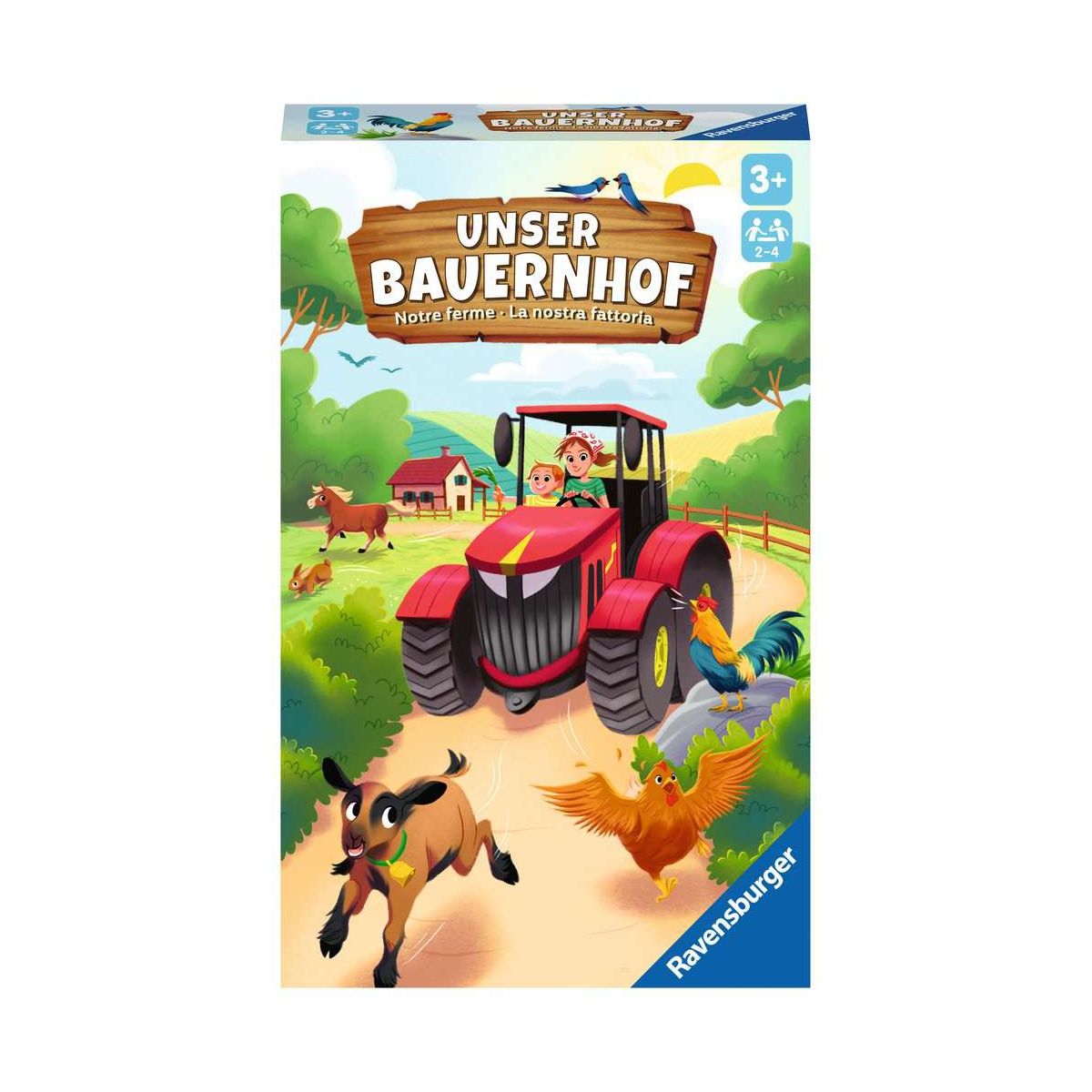 Muuuuh! Määäh! Kikeriki! Was ist denn das für ein Lärm am frühen Morgen? Bäuerin Frieda traut ihren Augen kaum, denn alle Tiere sind entwischt und toben fröhlich auf der Wiese hinter dem Bauernhof. Jetzt ist gute Zusammenarbeit gefragt: Alle helfen mit, sie wieder sicher in ihre Ställe zu bringen. Mit dem roten Traktor geht´s los. Doch schaffen es die Kinder, die Tiere von der Wiese zu locken, bevor die Sonne untergeht? Ein charmantes Farbwürfel- und Sammelspiel für kleine Bauernhof-Fans ab 3 Jahren.Zu Beginn befinden sich in der Mitte des Spielplans die ausgebüxten Tiere. Abwechselnd würfeln die Spieler und stellen den Traktor auf das nächste Feld der gewürfelten Farbe. Auf jedem Feld gibt es eine Aktion: Mal darf man ein Tier mit Leckerlis von der Weide zu sich locken, mal ein Zaunteil aus dem Vorrat nehmen. Bei einem Joker können die Kinder aus diesen beiden Möglichkeiten wählen. Doch landet der Traktor bei der Sonne, wandert diese etwas weiter in Richtung Sonnenuntergang. Wenn vorher alle Tiere im Stall versorgt sind, haben alle gemeinsam gewonnen!Für etwas ältere Kinder gibt es eine Wettbewerbsregel, bei der der Spieler mit den meisten Tieren gewinnt. Auch hier darf die Sonne zuvor nicht untergehen..