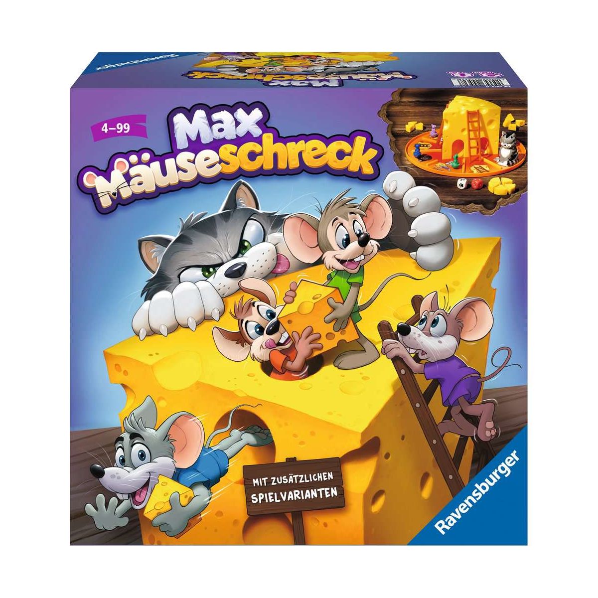 Leckerer Käse! Welche kleine Maus will davon nicht die meisten Ecken einsammeln? Je nachdem auf welches Feld die Mäuse bei ihrem Zug ziehen, dürfen ein oder zwei Stück Käse aus dem Vorrat genommen werden. Doch Vorsicht! Kater Max schleicht um die Ecken herum. Wer nicht aufpasst, ist seine Käse-Beute schnell wieder los. Und manchmal ist die Samtpfote sogar so frech, einen der kleinen Nager für eine kurze Weile festzuhalten. Wer lässt sich nicht beirren, sammelt als erster 5 Käse-Ecken ein und gewinnt dieses zauberhafte Gesellschaftsspiel? Ein fröhlicher Spiel-Spaß für Kinder ab 4 Jahren.Bewegt werden die Mäuse bei dem Würfel-Laufspiel über einen Augen-Würfel. Ein zweiter Würfel, der sogenannte Pfoten-Würfel, bestimmt die Laufweite des Katers. Bei jedem Zug werden immer beide Würfel geworfen, dann zuerst die Maus und danach der Kater bewegt. Je nachdem auf welchem Feld die Mäuse bei ihrem Zug landen, dürfen sie eine oder zwei Käse-Ecken sammeln. Immer wieder stoßen die kleinen Nager bei ihrem Wettlauf um den Käse auch auf Sonderfelder. Zum Beispiel das Leiterfeld: Trifft eine Maus auf dieses, darf sie die Leiter hinauf auf den Käse klettern, um dann durch die Löcher wieder hinunter auf das Spielfeld zu rutschen. Wo sie jetzt wohl landet? Dann gibt es auch noch das Feld mit dem Mauseloch: Hier sind die Mäuse vor Kater Max sicher, der nichts lieber macht, als die kleinen Mäuschen zu ärgern. Wer sichert sich als Erster Spieler fünf leckere Käse-Ecken und gewinnt die Käse-Jagd?.