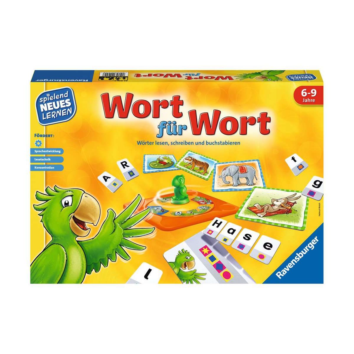 Bei dem Kinderspiel Wort für Wort für 1-4 Spieler heißt es Wörter lesen, schreiben und buchstabieren. Wie wird Pirat geschrieben? Wer legt mit den richtigen Buchstaben das passende Wort zu seinem Bild? Wie viele Buchstaben man nehmen darf, zeigt der freche Papagei auf der Drehscheibe. Ob das Wort richtig geschrieben ist, können die Kinder auf der Bildrückseite selbst kontrollieren.Auf spielerische Art und Weise können die Kinder bei diesem Brettspiel erste Lesekenntnisse erwerben und festigen. Zusätzlich werden Sprachentwicklung und Konzentration der 6- bis 9-Jährigen gefördert. Lernspiele, die richtig Spaß machen: So heißt das Motto der Lernspielreihe von Ravensburger, mit der Kinder in den lernintensivsten Jahren in ihrer Entwicklung unterstützt werden. Alle Spiele werden nach neuesten wissenschaftlichen und pädagogischen Standards entwickelt und geprüft. Die Lernstoffe sind in spannende Geschichten verpackt, eine Vielfalt an Materialien und Methoden erlaubt das Lernen mit allen Sinnen..