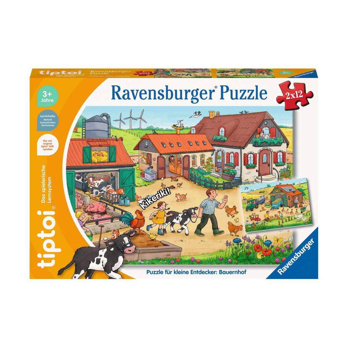 Das tiptoi Puzzle für kleine Entdecker Bauernhof vermittelt Wissen und macht Spaß.Welche Tiere leben auf dem Bauernhof? Welche Maschinen kommen auf dem Hof zum Einsatz? Und welche Werkzeuge werden für die Arbeit auf einem Bauernhof benötigt? Die Kinder setzen die Puzzles zusammen und erkunden mit tiptoi interaktiv den gesamten Bauernhof. Dabei erfahren sie spannendes Wissen und fördern durch Suchspiele nebenbei ihre Konzentration.Im Puzzle für kleine Entdecker Bauernhof runden realistische Geräusche, lustige Spiele und ein schönes Lied das Erlebnis für Kinder ab 3 Jahren ab. Ein Tag auf dem Bauernhof ist spannend, lustig und wunderschön!Tippen, spielen, lernen! tiptoi macht Bücher und Spiele lebendig. Tippen die Kinder mit dem Stift auf Bilder und Texte, erklingen Geräusche, Sprache und Musik. So macht Lernen richtig Spaß! Das tiptoi-Sortiment umfasst Bücher und Spiele mit den wichtigsten Lern- und Wissensthemen für Kinder ab 2 Jahren. Die Audiodateien lädt man einfach, sicher und schnell über den tiptoi Manager oder die optional erhältliche Ladestation auf den Stift.tiptoi-Stift nicht enthalten. Muss separat erworben werden..