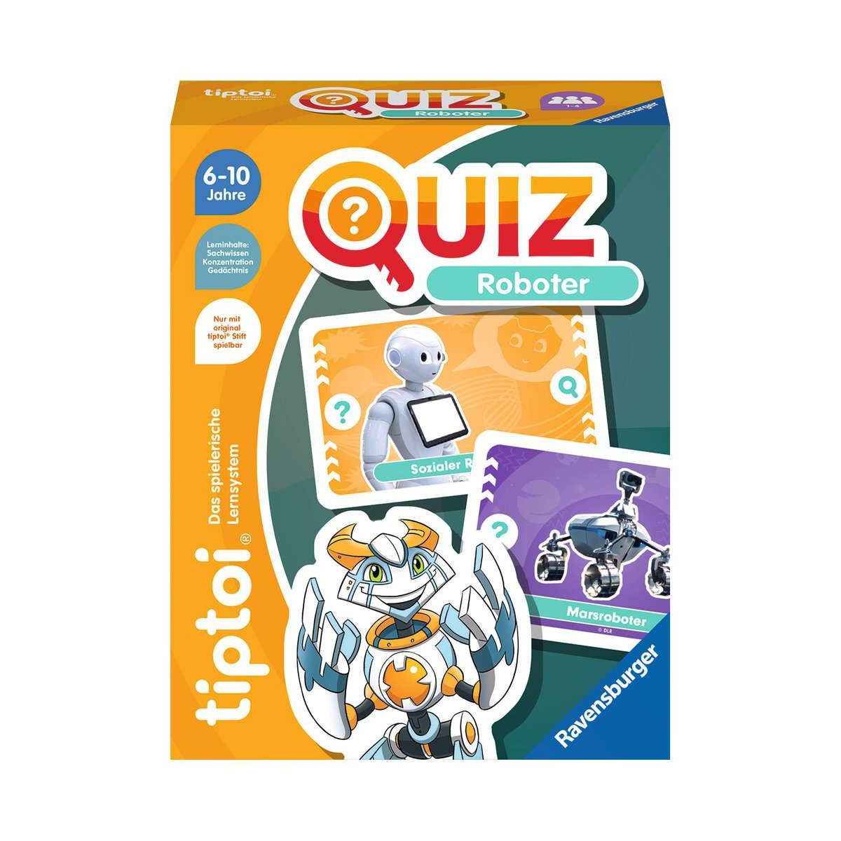 Auf der Insel Quizamui veranstalten die lustigen Quiz-Tiere regelmäßig ein Quiz-Turnier. Beim Quiz Roboter nehmen die Kinder an einem dieser Turniere teil. Dabei beantworten sie Fragen rund um das Thema Roboter: Was ist ein Roboter? Welche Roboter gibt es? Und wie funktioniert ein Staubsaugerroboter? Aber Achtung: Die frechen Quiz-Tiere stellen ganz schön kniffelige Fragen. Wer zuerst das Super-Quiz-Tier erreicht und drei besonders schwierige Fragen beantwortet, gewinnt das Spiel.Quiz Roboter ist ein spannendes und kompetitives Quiz-Kartenspiel. Die Kinder messen sich in einem Wettlauf zum Super-Quiz-Tier. Wer eine Frage richtig beantwortet, darf zur nächsten Karte vorrücken und ist dem Ziel einen Schritt näher. Wer falsch antwortet, erhält als Ausgleich eine Joker-Karte, die in der nächsten Runde hilft, die kniffeligen Quiz-Fragen zu beantworten. Ganz nebenbei lernen sie spielerisch viele wichtige Fakten über Roboter.Tippen, spielen, lernen! tiptoi macht Bücher und Spiele lebendig. Tippen die Kinder mit dem Stift auf Bilder und Texte, erklingen Geräusche, Sprache und Musik. So macht Lernen richtig Spaß! Das tiptoi-Sortiment umfasst Bücher und Spiele mit den wichtigsten Lern- und Wissensthemen für Kinder ab 2 Jahren. Die zugehörigen Audiodateien lädt man einfach, sicher und schnell über den tiptoi-Manager oder die optional erhältliche Ladestation auf den Stift.tiptoi-Stift nicht enthalten. Muss separat erworben werden..