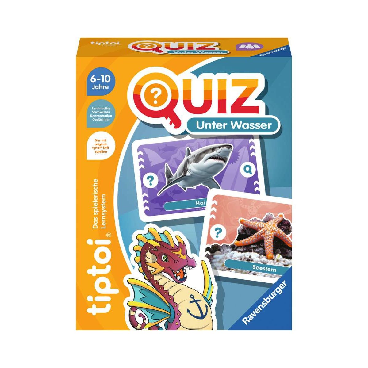 Auf der Insel Quizamui veranstalten die lustigen und neugierigen Quiz-Tiere ein Quiz-Turnier zum Thema Unter Wasser. Dabei beantworten die Kinder Fragen rund um Korallenriffe, Fische und Schiffswracks. Aber Achtung: Die frechen Quiz-Tiere stellen ganz schön kniffelige Fragen. Wer zuerst das Super-Quiz-Tier erreicht und drei besonders schwierige Fragen beantwortet, gewinnt das Spiel.Quiz Unter Wasser ist ein spannendes und kompetitives Quiz-Kartenspiel. Die Kinder messen sich in einem Wettlauf zum Super-Quiz-Tier. Wer eine Frage richtig beantwortet, darf zur nächsten Karte vorrücken und ist dem Ziel einen Schritt näher. Wer falsch antwortet, erhält als Ausgleich eine Joker-Karte, die in der nächsten Runde hilft, die kniffeligen Quiz-Fragen zu beantworten. Ganz nebenbei lernen sie spielerisch viel Interessantes über die Unterwasserwelt.Tippen, spielen, lernen! tiptoi macht Bücher und Spiele lebendig. Tippen die Kinder mit dem Stift auf Bilder und Texte, erklingen Geräusche, Sprache und Musik. So macht Lernen richtig Spaß! Das tiptoi-Sortiment umfasst Bücher und Spiele mit den wichtigsten Lern- und Wissensthemen für Kinder ab 2 Jahren. Die zugehörigen Audiodateien lädt man einfach, sicher und schnell über den tiptoi-Manager oder die optional erhältliche Ladestation auf den Stift.tiptoi-Stift nicht enthalten. Muss separat erworben werden..