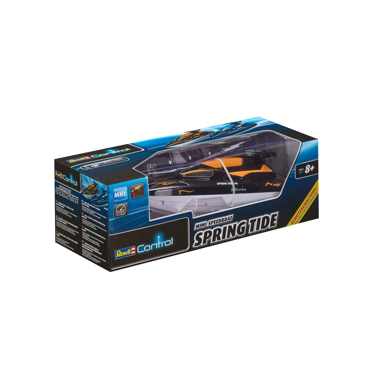 Die Spring Tide garantiert spannende Rennen in jedem Süßwasser-Gewässer und Pool. Der große Rumpf des Bootes pflügt durch jede Welle, so dass Kentern fast unmöglich ist. Zudem sorgen zwei kraftvolle Elektromotoren für ordentlich Fahrt und garantieren Rennspaß auf der ganzen Strecke. Mit der handlichen MHz-2-Kanal-Fernsteuerung lässt sich das Rennboot zielsicher in jeden Hafen manövrieren. (5 x 1,5 V AA Batterien nötig/nicht enthalten) Mit Schutzschaltung! Die Boote schalten sich erst im Wasser ein..