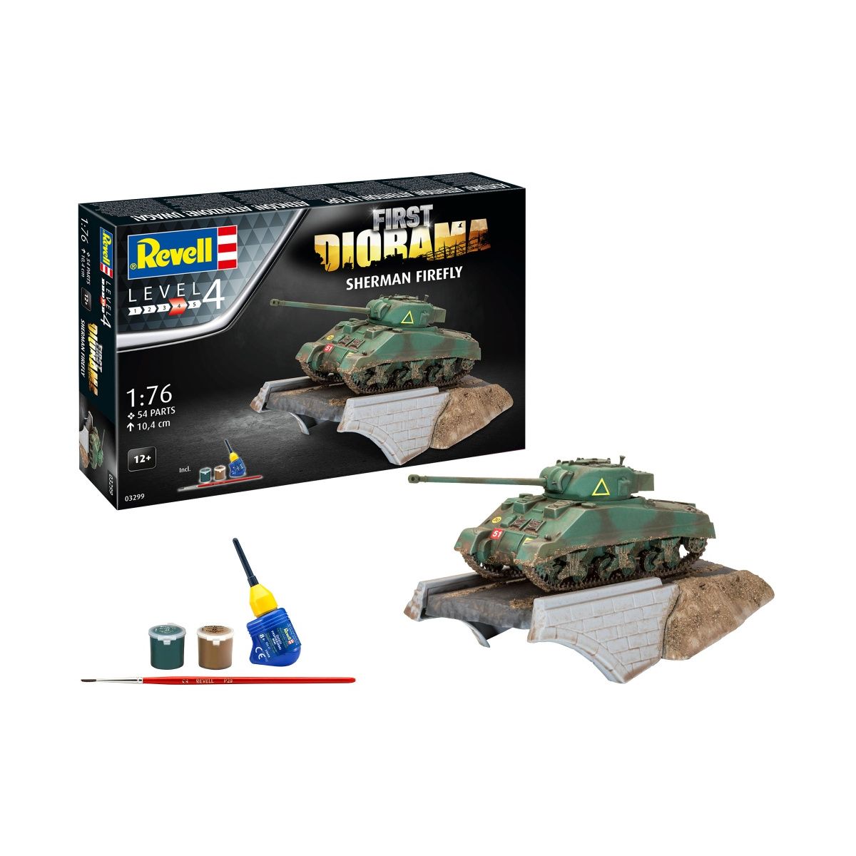 Einsteiger-Set zur Gestaltung des ersten eigenen Dioramas, um das gebaute Modell in einer realistischen Szenerie zu präsentieren. - Bausatz des stärksten britischen WK2 Panzers Sherman Firefly - Dioramenplatte - Basisfarben, Kleber und Pinsel Authentische Darstellung folgender Versionen: - 2nd Fife and Forfar Yeomanry, Rheinland 1945 - 2nd Battaillon Coldstream Guards, Normandy, June 1944.