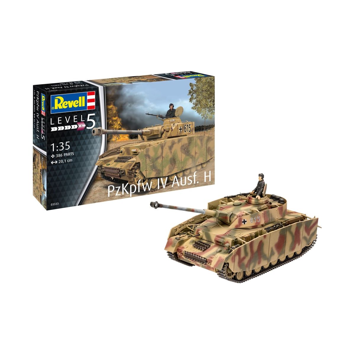 Der Panzerkampfwagen IV bildete das Rückgrat der deutschen Panzerverbände im Zweiten Weltkrieg. Vom ihm wurden in der Zeit zwischen 1933 und 1945 größere Stückzahlen hergestellt als von jedem anderen deutschen Kampfpanzer dieser Zeit. Die Ausführung H, die erstmals mit Seitenschürzen zur Erhöhung des Panzerschutzes versehen war, wurde von 1943 bis 1944 gebaut. - Drehbarer Turm - Originalgetreue Vinylketten - 1 Figur / Besatzung Der Panzerkampfwagen IV bildete das Rückgrat der deutschen Panzerverbände im Zweiten Weltkrieg. Maßstab 1/35. 386 Teile. 20,0 cm Länge. Geeignet ab 13 Jahren. Lieferumfang: Kunststoffmodellbausatz (nicht zusammengebaut) Bebilderte, mehrsprachige Bauanleitung Abziehbilder.