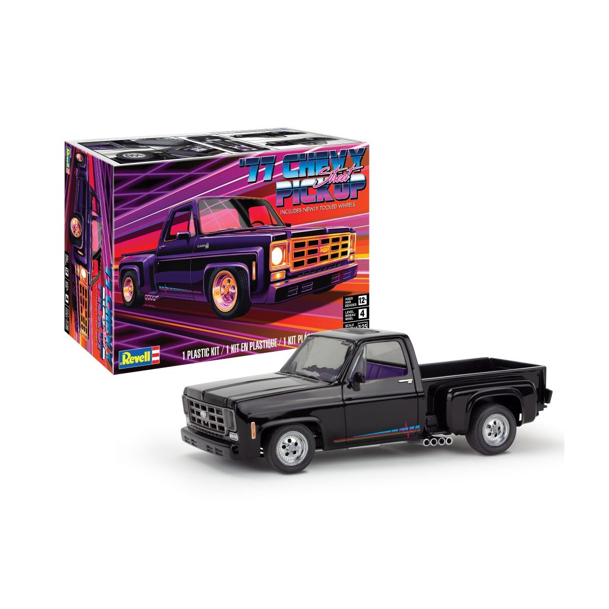 Hochdrehende 4X4-Pickups hatten zu Beginn der Achtzigerjahre die Aufmerksamkeit der Amerikaner, aber Mitte des Jahrzehnts eroberten schlanke, bodennahe Street Trucks das Rampenlicht. Der 77er Chevy® Street Truck von Revell zelebriert diese unvergessliche Ära, indem er das klassische Squarebody- Design der Bowtie-Marke mit Modifikationen im Stil der Achtzigerjahre kombiniert, darunter ein Tuned-Port Injected 350 V-8 mit wildem Seitenauspuff und einem speziellen Überrollbügel für die Front, zusammen mit zeitgemäßen Champ 500-Rädern und Aufklebern im California-Stil. - Klassisches Chevrolet squarebody Pickup-Styling mit Stufenbett und zu öffnender Heckklappe - Neu angefertigte Champ 500-Felgen mit großen und kleinen Niederquerschnittsreifen - Abgestimmter Chevy 350 V-8 mit Port-Einspritzung und Vierganggetriebe - Leicht zu montierendes Chassis mit tiefergelegter Federung - Zu den Sonderausstattungsmerkmalen gehören eine geriffelte Frontschale, Außenspiegel im Flaggenstil, ein seitlich ausfahrbarer Auspuff und ein Sonnendach - Völlig neuer Abziehbilderbogen mit einer großen Auswahl an New-Wave-Grafiken im Stil der achtziger Jahre.