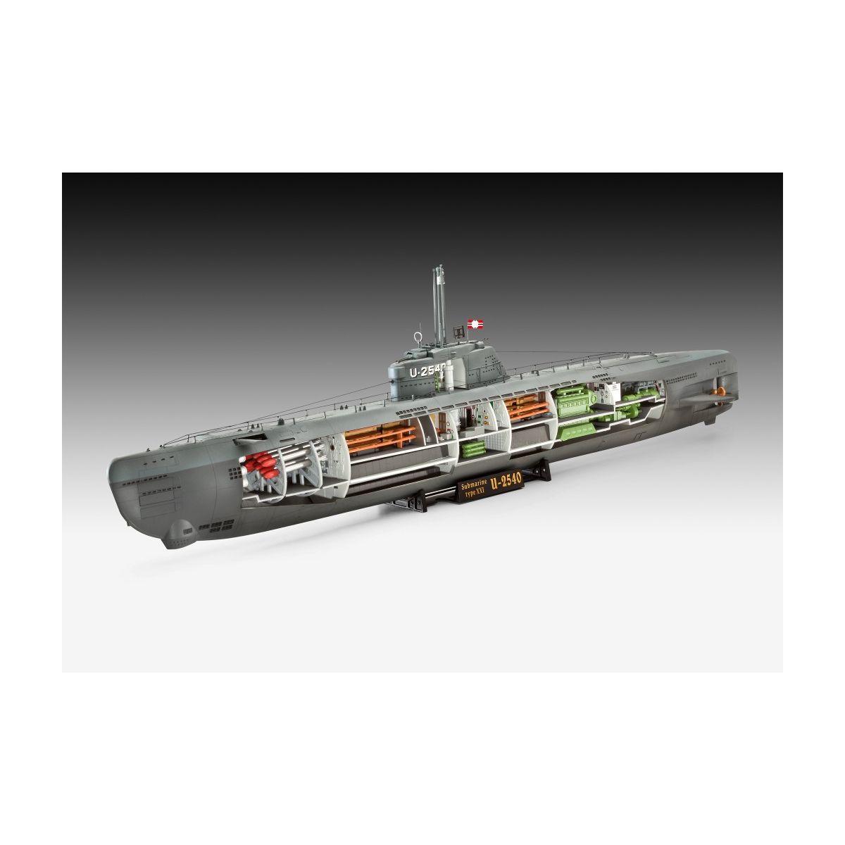 Mit dem Typ XXI besaß Deutschland Anfang 1945 das fortschrittlichste U-Boot der damaligen Welt. Durch zahlreiche technische Neuerungen konnte es unbeschränkt unter Wasser fahren, da die Dieselmotoren die benötigte Frischluft durch einen speziellen Schnorchel ansaugten. Die für Unterwasserfahrten entworfene Linienform und eine dreifach größere Batteriekapazität ergaben die sensationelle Unterwassergeschwindigkeit von 17 Knoten. Weitere Neuerungen waren geräuscharme Elektromotoren für Schleichfahrten, hochempfindliche Ortungsgeräte und 2 cm Flakgeschütztürme. Das Modell gibt durch die aufgetrennte linke Rumpfaußenwand einen authentischen Einblick in dieses wegweisende U-Boot. Viele Räume sind detailgetreu nachgebildet, so auch die Diesel- und Elektromotoren. Einblicke in die Kommandozentrale und Mannschaftswohnräume lassen das Leben unter Wasser erahnen. Das Abziehbild umfasst Innenraumdetails und Kennungen für U2540, das am 24.02.1945 in Dienst gestellt worden war. Nach kurzer Ausbildungsfahrt wurde U2540 am 04.05.1945 von der Besatzung in der Flensburger Förde versenkt. 1957 wieder gehoben, diente es der Bundesmarine als Erprobungsboot Wilhelm Bauer. Heute kann U2540 als Museumsboot besichtigt werden. - Aufgetrennte linke Rumpfaußenwand gibt Einblick in den Innenraum - Detaillierte Oberflächenstrukturen - Detaillierter Torpedoraum - Mannschaftswohnräume - Detaillierte Kommandozentrale - Turm mit Innenstruktur - Detaillierte Diesel- und Elektromotoren - Batterie/Akku-Räume - Bewegliche Tiefen- und Seitenruder - Drehbare Zwillingsflaktürme - Detaillierter Turmaufbau mit Antennen, Periskop und Schnorchelmast - Authentisches Abziehbild für U2540 mit Innenraumdetails.