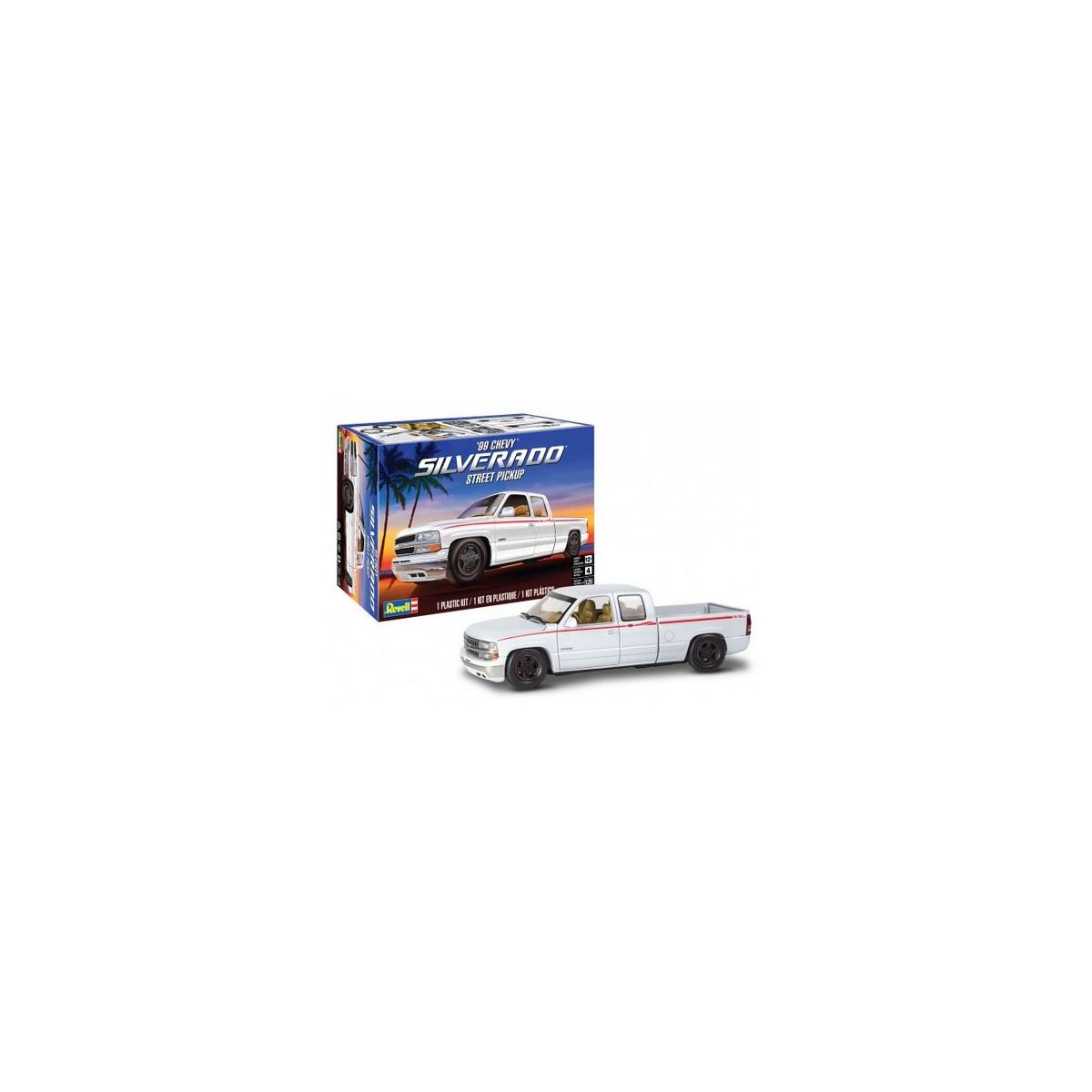 Die heutigen Truck-Enthusiasten bezeichnen die verschiedenen Generationen der Chevrolet® Full-Size- Pickups mit verschiedenen Spitznamen, und dieser Silverado® ist als NBS (New Body Style) bekannt. Der 99er Chevy® Silverado® 1500 zeichnete sich bei seiner Einführung durch ein völlig neues Styling, neue Vortec V-8-Motoren und eine völlig neue Rahmenkonstruktion mit einem hochmodernen hydrogeformten Vorderteil aus. Zu den weiteren neuen Standardmerkmalen gehörten eine Hecktür auf der Beifahrerseite bei den Modellen mit verlängertem Fahrerhaus sowie Vierrad-Scheibenbremsen. Ihr neuer Revell-Bausatz wurde im modernen Street-Truck-Stil überarbeitet. Wir haben das klassische Design weitgehend beibehalten, einschließlich der Werksräder und -reifen, aber wir haben eine tiefergelegte Aufhängung und eine spezielle Auspuffanlage hinzugefügt. Zu den optionalen Teilen gehören ein Satz big-n-little 20- und 21-Zoll-Niederquerschnittsreifen auf Fünfspeichenrädern und ein auf dem Dach montierter Heckspoiler. - Beliebter Extended-Cab-Aufbau - Hochdetaillierter 5,3-Liter-Vortec-V-8-Motor und Fahrgestell mit Heckantrieb und spezieller Federung - Wahl zwischen werksseitigen oder kundenspezifischen Rädern und Reifen - Neuer Dekorbogen mit einer Auswahl an Custom-Grafiken im California-Stil - Verchromte Teile.