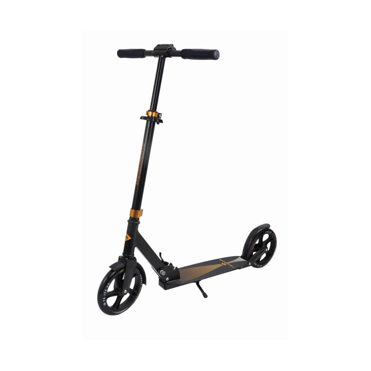 Der neue Street Master 2.0 aus dem Hause Schildkröt ist ein edler und hochwertiger 200mm Aluminium- Scooter. Sein ausgewogenes Fahrverhalten und der niedrige Schwerpunkt machen den Street Master zum idealen Begleiter für Jung und Alt. Die umfangreiche Verstellbarkeit des Lenkers, das XXL-Deck, das dezente Design in matt-schwarz mit goldenen Elementen aus eloxiertem Aluminium machen den Scooter zum absoluten Hingucker. Deck: Das lange und breite Deck (46 x 13 cm) aus hochwertigem Aluminium ist abgesenkt. Die Tieferlegung und der abgesenkte Schwerpunkt verleiht dem Scooter auch bei flotterer Fahrt ein sicheres Fahrverhalten. Die Kasten-Konstruktion auf der Deck-Unterseite macht den Street Master 2.0 deutlich verwindungssteifer und robuster - viele andere Scooter verzichten auf dieses teurere Ausstattungsmerkmal und verwinden sich sind deshalb gerade bei schwereren Fahrern instabil. Die Oberfläche des Decks ist mit einem Design-Griptape bezogen. Diese raue Oberfläche sorgt für sicheren und rutschfesten Stand während der Fahrt. Zusätzlich verfügt der Street Master 2.0 über einen Kick-Ständer. Dieser unten am Deck befindliche Ständer sorgt dafür, dass der Street Master jederzeit sicher abgestellt werden kann. Lenker das Lenkrohr: Der Lenker und das Lenkrohr sind ebenfalls aus hochwertigem Aluminium gefertigt. Der Lenker ist sehr breit (47cm), das Fahren ist somit wesentlich angenehmer und entspannter – speziell auch für Erwachsene. Die klappbaren Lenkerenden ermöglichen einen kompakten Transport in der Bahn oder im Auto. Das von vielen Scootern bekannte lästige Klappern der Lenkerenden wird durch einen zusätzlichen Schnellspann-Verschluss am Lenkerkopf verhindert. Am Lenker sind neue 2-Komponenten-TPE Ergo-Komfort-Griffe montiert, die sehr angenehm in der Hand liegen. Die Griffe sind durch jeweils zwei Schellen gegen das Verrutschen und Verdrehen gesichert. Das Lenkrohr ist mit einer robusten Doppelklemme (2 Inbus-Schrauben) an der Gabel montiert. Die Lenkstange ist vierfach höhenverstellbar (76-100cm) und mit einer Doppelklemme fixiert. Räder Bremse: Die großen 200 mm Räder aus griffigem PU laufen wesentlich besser auch auf unebenen und schlechten Straßen als kleinere Räder. Die hochwertigen ABEC7 Radlager sorgen für einen leichten Lauf des Rollers. Am Hinterrad befindet sich eine robuste Hi-Performance Bremse aus Stahl (für geringeren Abrieb und lange Haltbarkeit), welche gleichzeitig als Schutzblech wirkt. Am Vorderrad befindet sich ein extra Schutzblech. Die Gabel vorne ist ebenfalls aus Stahl, Aluminium wäre nicht stabil genug und nicht robust. ALLE anderen Teile sind komplett aus Aluminium gegen Korrosion und für ein möglichst geringes Gewicht von nur 4,5kg. Maximales Nutzergewicht 100 kg – somit auch für Erwachsene geeignet! Der Scooter wird vormontiert in einem Transportkarton geliefert. Mit dem beiliegenden Inbusschlüssel kann der Lenker leicht und ohne größere handwerkliche Begabung montiert werden. Über Schildkröt: Die über 100 Jahre alte deutsche Marke Schildkröt gilt als Erfinder des Tischtennisballs. Heute bietet Schildkröt neben Tischtennis auch eine sehr umfangreiche Funsport-, Rollsport- und Fitness-Kollektion an und gilt in gewissen Bereichen als Marktführer. Die Produktentwicklung erfolgt ausnahmslos in Deutschland. Die weltweiten Produktionsstätten werden streng überwacht und genügen höchsten Sozialstandards. ACHTUNG! vor Benutzung Gebrauchsanleitung lesen und beachten / nur mit geeigneter Schutzausrüstung benutzen / Nicht im Straßenverkehr verwenden / maximales Nutzergewicht 100kg / Vor jeder Fahrt alle Komponenten auf festen Sitz und Unversehrtheit überprüfen / Nicht bei Dunkelheit oder schlechten Sichtverhältnissen fahren / Nur auf geeigneten Flächen die eben, sauber und trocken sind benutzen / Altersempfehlung: 8+ / Die Aufsicht durch einen Erwachsenen wird dringend empfohlen!.