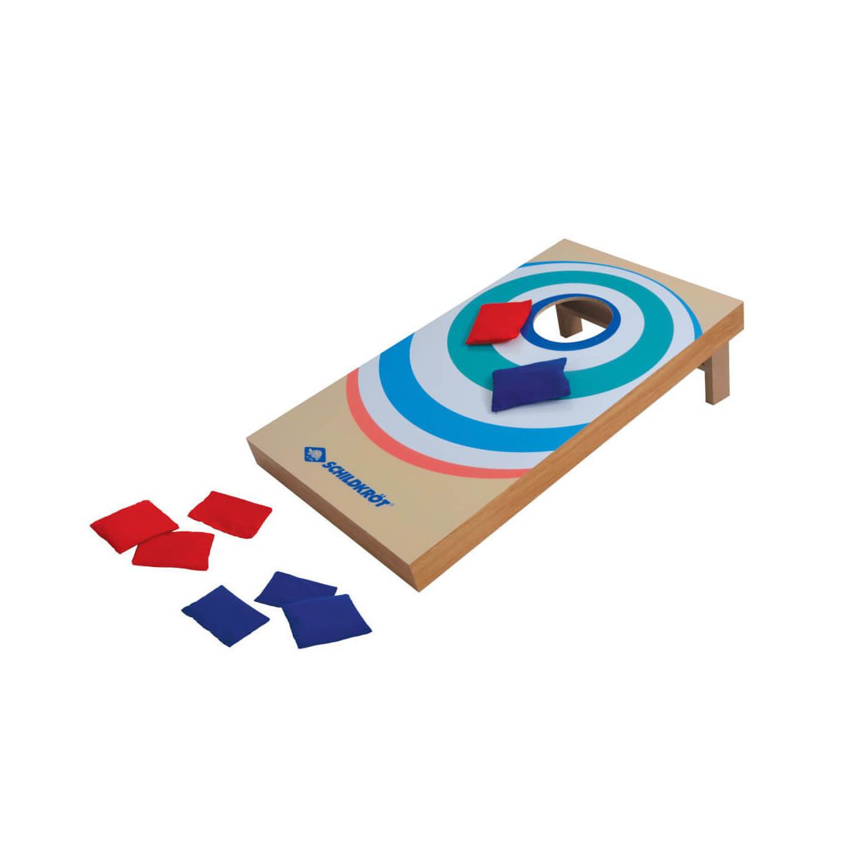 Das neue Schildkröt Cornhole Set (auch bekannt als Bean Bag oder Sackloch) ist ein lustiges Freizeitspiel für 2-4 Spieler, das Geschicklichkeit und Treffsicherheit erfordert. Bei dem Trendspiel aus Amerika müssen die 4 roten und 4 blauen Sandsäckchen in das Loch der beiden schrägen Zielflächen (52 x 30 x 14cm) geworfen werden. Das Cornhole Set enthält 2 Holzbretter mit ausklappbaren Beinen sowie 8 mit Sand gefüllte Stoffsäcke (4x Rot / 4x Blau). Der Treffer im Loch zählt 3 Punkte, ein Treffer auf der Plattform ergibt nur einen Punkt. Ideales Spiel mit Freunden im Freien, das an Wochenenden oder im Urlaub überall mitgenommen werden kann. Hergestellt aus MDF-Holz. Lieferung im Farbkarton. ACHTUNG! Nicht für Kinder unter 3 Jahren geeignet. Artikel enthält Kleinteile, Verschluckungs- und Erstickungsgefahr. Über Schildkröt: Die über 100 Jahre alte deutsche Marke Schildkröt gilt als Erfinder des Tischtennisballs. Heute bietet Schildkröt neben Tischtennis auch eine sehr umfangreiche Funsport-, Rollsport- und Fitness-Kollektion an und gilt in gewissen Bereichen als Marktführer. Die Produktentwicklung erfolgt ausnahmslos in Deutschland. Die weltweiten Produktionsstätten werden streng überwacht und genügen höchsten Sozialstandards..