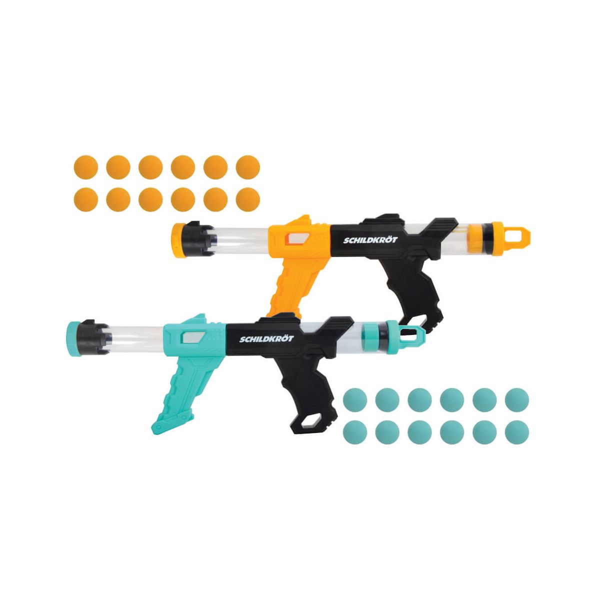 Das Schildkröt Fire Blasters Set besteht aus zwei verschiedenfarbigen Schaumkugel-Popperpistolen, die jeweils 12 Bälle fassen. Die Popper Pistolen sind einfach zu bedienen, schnell zu laden und können mehrere Bälle gleichzeitig abfeuern. Indoor und Outdoorspaß für Groß und Klein. Kaum Verletzungsgefahr durch Schaumstoffmunition. Schussweite bis zu 6 Metern. Inhalt: 2 Popper Pistolen (40 x 15cm) und 12 orange und 12 blaue Schaumstoffbälle ( 2,7cm). Im Farbkarton. Altersempfehlung: 6+..