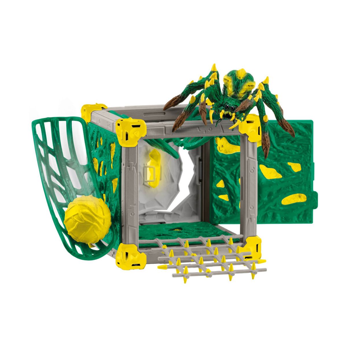 Die Dschungeltarantel ist ein gefährlicher Gegner. Ihr giftiger Biss ist gefürchtet. Kein Wunder, dass sie ausgewählt wurde, den Weltenkristall im BattleCave zu beschützen! Nun lauert sie auf die Angreifer und überrollt sie mit einer großen Kugel. Die lässt sie über die Rollbahn an der Seite auf die Gegner herab. Man sollte nicht versuchen, die Dschungeltarantel auszutricksen und über das Dach einzusteigen! Dort hat sie unter Lianen nämlich eine Falltür versteckt. Wer drauftritt, fällt ihr direkt in die giftigen Arme. Fies! Die ELDRADOR® CREATURES BattleCaves verwandeln jedes Kinderzimmer in eine Actionzone! Wer stellt sich dem atemberaubenden Kampf? Alle BattleCaves können kombiniert werden. So lauern finstere Tunnel, und gemeine Fallen auf die Angreifer. In der großen Arena treffen sie zum Duell aufeinander. Was für ein Kampf!