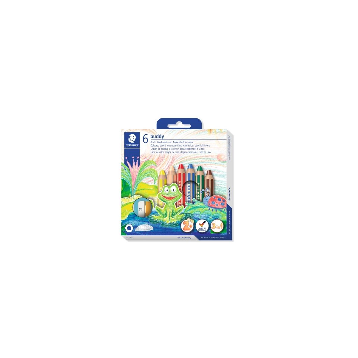 Farbstift junior 140 Buntstift. 3in1: Bunt-, Wachsmal- und Aquarellstift in einem. empfohlenes Mindestalter: 2+ y. Ausführung Mine: Bezeichnung der Härte: sehr weich. Stärke der Mine: 9.45, Schreibfarbe der Mine: -30 lichtblau, -50 gelbgrün, -5 grün, -76 van-Dyke-braun, -9 schwarz, -1 gelb, -43 hautfarben, -4 orange, -2 rot, -20 magenta, -6 violett, -3 blau, wasservermalbar. Ausführung Schaft: Schaft lackiert. Ausführung der Schaftform: abgerundete hexagonale Form, Lackierung auf Wasserbasis gegeben, Farbe des Schaftes: in Minenfarbe. Material des Schaftes: Holz aus nachhaltig bewirtschafteten Wäldern. Größe Stift ( x L): Durchmesser: 13.9 mm, Länge: 125 mm. Art der Verpackung und Inhalt: Ausführung der Lieferzusammenstellung: Kartonetui mit 6 Farben + 1 ST Spitzer..