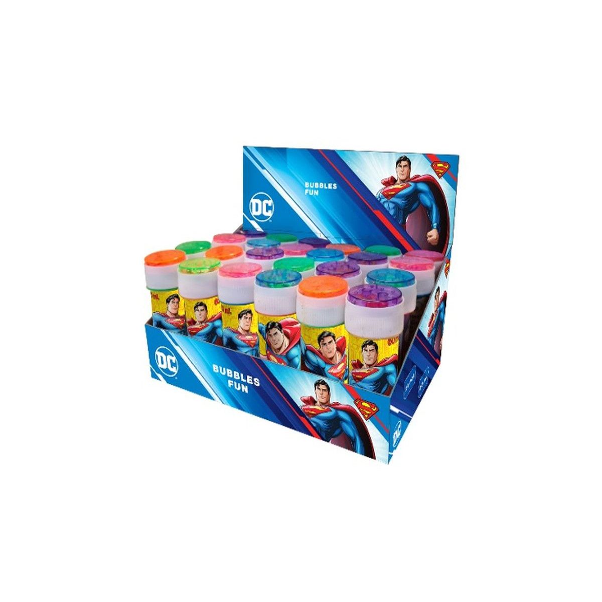 Seifenblasendosen mit Superman Aufdruck. 24 Stück im Display. Enthält ca. 60 ml Seifenblasenflüssigkeit. Maße der Dose ca. 3,5x3,5x12 cm. Für Kinder ab 3 Jahren..