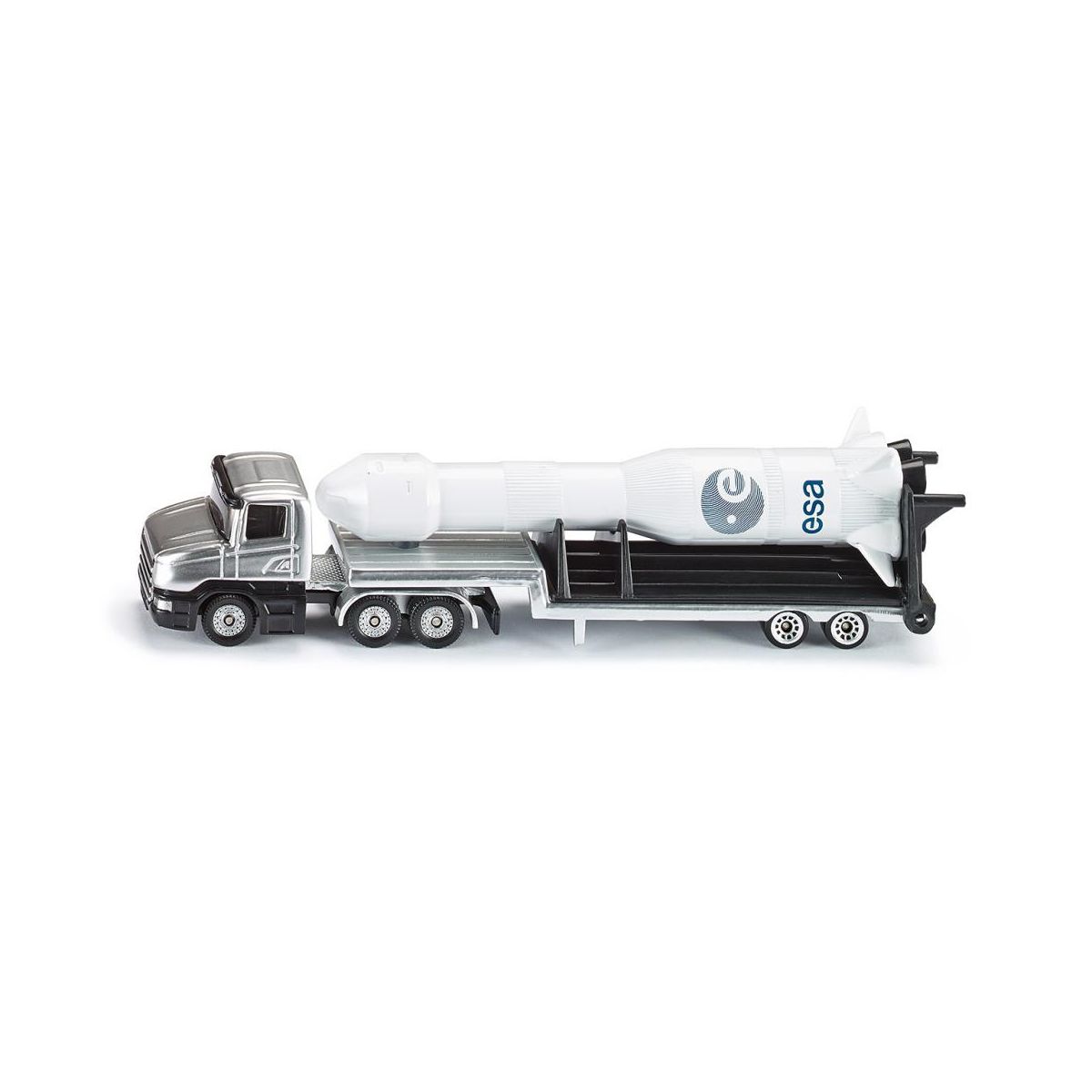 Detailliertes Spielzeug eines Tiefladers mit esa''-Rakete zum Spielen und Sammeln, Für große und kleine Raketen- und Weltraum-Fans - Robustes und stabiles Design dank Metallkarosserie, Aufklappbare Raketenabschussvorrichtung, Abnehmbare Rakete, Sehr gute Rolleigenschaften durch Bereifung aus hochwertigem Kunststoff - Ideal als Geschenk für Kinder zu bspw. Geburtstagen oder für zwischendurch geeignet, aber auch als Dekoration für Erwachsenen-Geburtstage oder Hochzeitsgeschenke - Perfekt zum platzsparenden Mitnehmen, Langanhaltender Spielspaß durch unzählige Kombinationsmöglichkeiten innerhalb der SIKU Spielwelt - Lieferumfang: 1x SIKU 1614 Tieflader mit Rakete, Material: Metall/Kunststoff, Abmessungen: 17,5 x 3,6 x 4,4 cm, Gewicht: 0,158 kg, Farbe: Silber/Weiß''.
