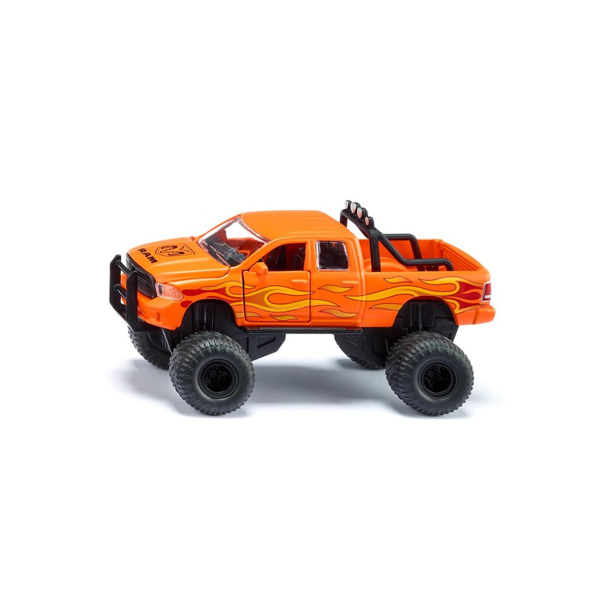 Detailliertes Spielzeugmodell eines höhergelegten Dodge RAM 1500 mit beidseitiger Flammenbedruckung zum Spielen und Sammeln, Für kleine und große Fans amerikanischer Fahrzeuge - Robustes und stabiles Design dank Metallkarosserie, Öffenbare Motorhaube, Türen und Heckklappe, Wechselbare Räder, Gummierte Ballonreifen, Einzeln gefederte Achsen, Detailgetreues Design - Ideal als Geschenk für Kinder zu bspw. Geburtstagen oder für zwischendurch geeignet, aber auch als Dekoration für Erwachsenen-Geburtstage oder Hochzeitsgeschenke - Perfekt zum platzsparenden Mitnehmen, Langanhaltender Spielspaß durch unzählige Kombinationsmöglichkeiten innerhalb der siku-Spielwelt - Lieferumfang: 1x siku 2358 RAM 1500 mit Ballonreifen, Material: Metall/Kunststoff, Maßstab: 1:50, Maße: 12 x 5,6 x 6,3 cm, Gewicht: 0,1557 kg, Farbe: Schwarz/Orange, Serie: SIKU SUPER.