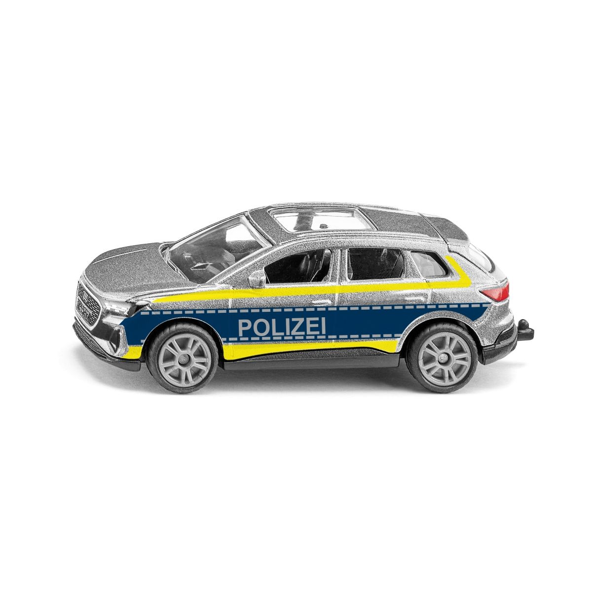 Polizei Einsatzfahrzeug Weiße Schrift auf blauem Grund und dazu der Schriftzug POLIZEI in Neon Gelb – so sieht die aktuelle PS-Flotte von Audi für die Polizei aus. Mit dem Q4 e-tron präsentiert der Autohersteller einen kompakten, aber dennoch geräumigen SUV mit klarem Design und sportlichem Esprit – perfekt also für den täglichen Einsatz auf Deutschlands Straßen. Auch im kleinen Maßstab für den Fuhrpark im Kinderzimmer überzeugt der Q4 mit seinem charakteristischen Look: Von der Metall-Karosserie mit klarer Verglasung, über die als hochwertiger Druck angedeuteten Scheinwerfer und Heckleuchten, bis zu den sportlichen Felgen mit gummierter Lauffläche gleicht das Modell dem Originalwagen bis ins kleinste Detail. Mit seiner Karosserie aus stabilem Metall und dem Fahrgestell aus robustem Kunststoff hält der Audi auch dem einen oder anderen Crash bei einer Verfolgungsjagd stand..